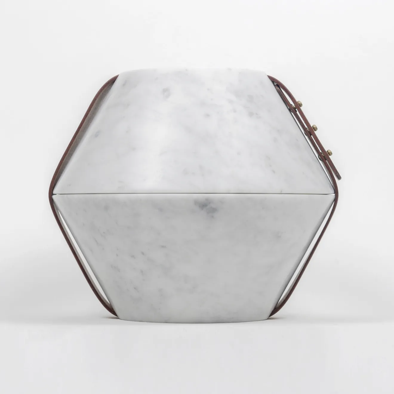 Questo elegante contenitore in marmo bianco di Carrara è stato lavorato al tornio e la sua forma evoca quella di una clessidra. Per conservare in modo sicuro ricordi e oggetti unici, i due coperchi del contenitore sono fissati con un cinturino in vera pelle.