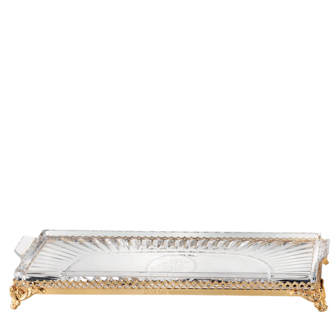Questo delizioso vassoio è la scelta perfetta per chi cerca una decorazione di alta classe da collocare in qualsiasi stanza. È realizzato con cristallo italiano al 24% tagliato a mano ed è stato inciso professionalmente con un’incantevole rosa opaca. Se non fosse già lussuoso, la base in ottone presenta splendide decorazioni ed è rifinita in oro 24 carati.