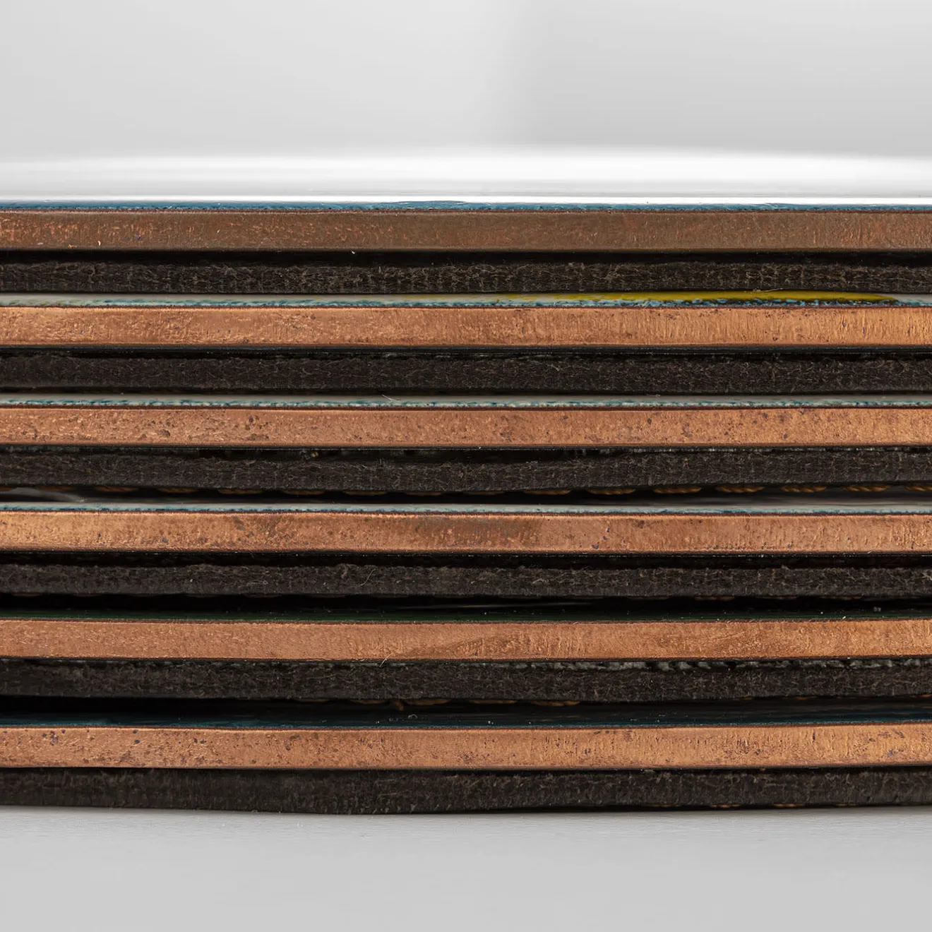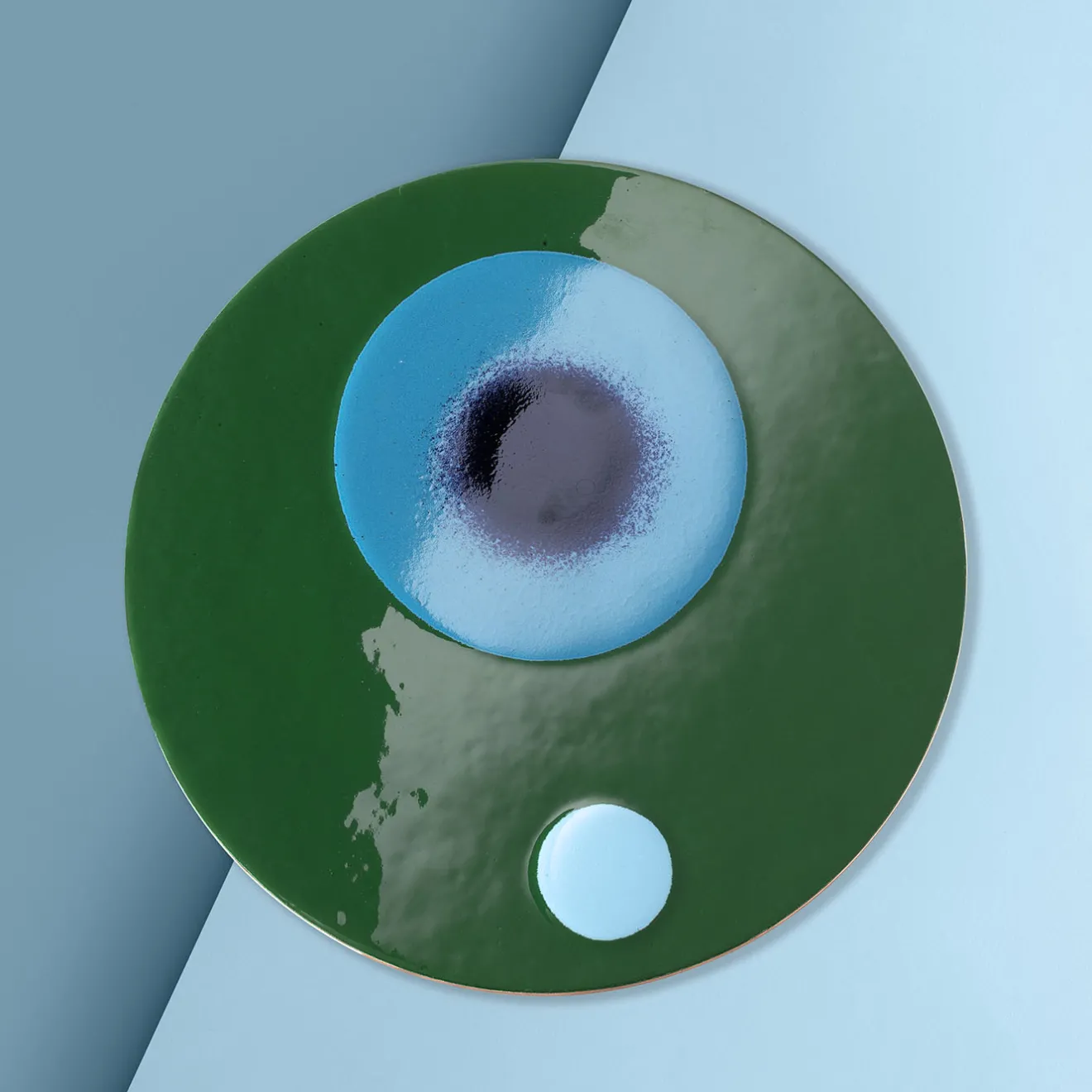 Collezione di piatti decorativi realizzati con la tecnica dello smalto a fuoco su rame. I colori e i motivi derivano da una visita al Guggenheim Museum di New York, mentre la tecnica è un omaggio al design italiano degli anni Cinquanta, Sessanta e Settanta. Il retro è smaltato e rivestito in pelle marrone scuro cucita a mano.
