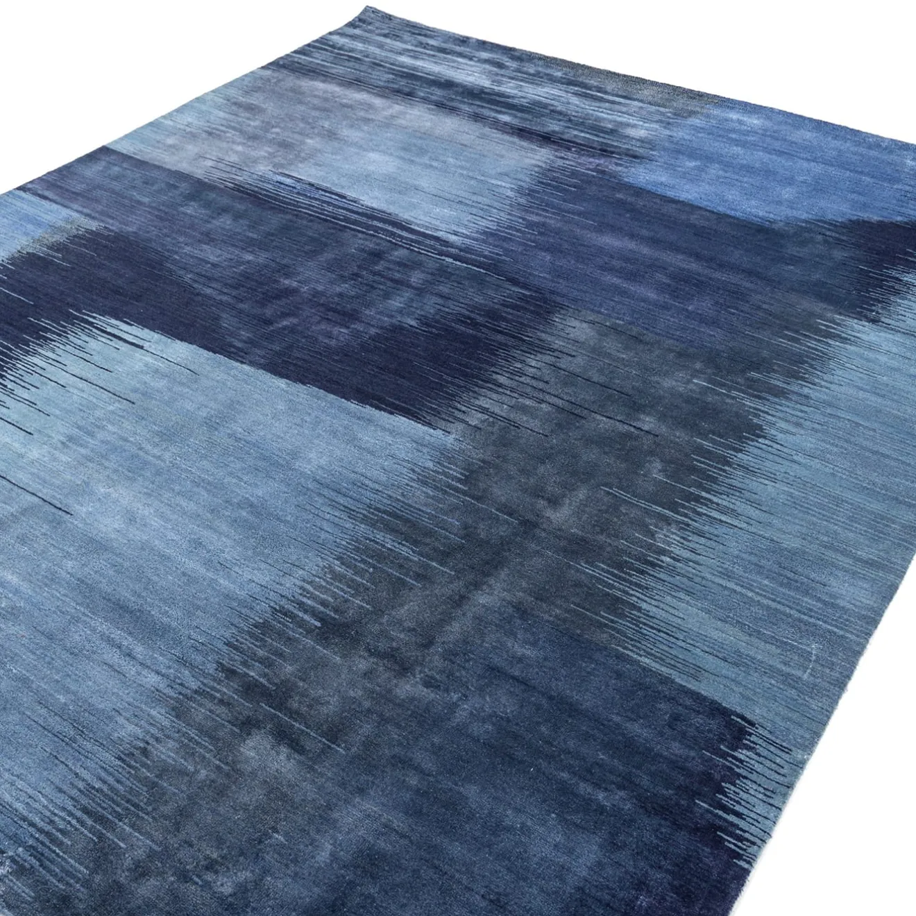 Questo tappeto annodato a mano nei colori blu antico e blu denim cattura il gioco fluido di luci e ombre. Realizzato con il 53% di lana cardata a mano e il 47% di seta di bambù, offre un effetto morbido e pittorico. Il design del tappeto invita a una tranquilla contemplazione, attirando l’occhio su dettagli intricati prima di svelare la sua presenza grandiosa e fluida. Un arazzo di toni e consistenze mutevoli, che evoca il persistente bagliore di un momento fugace.