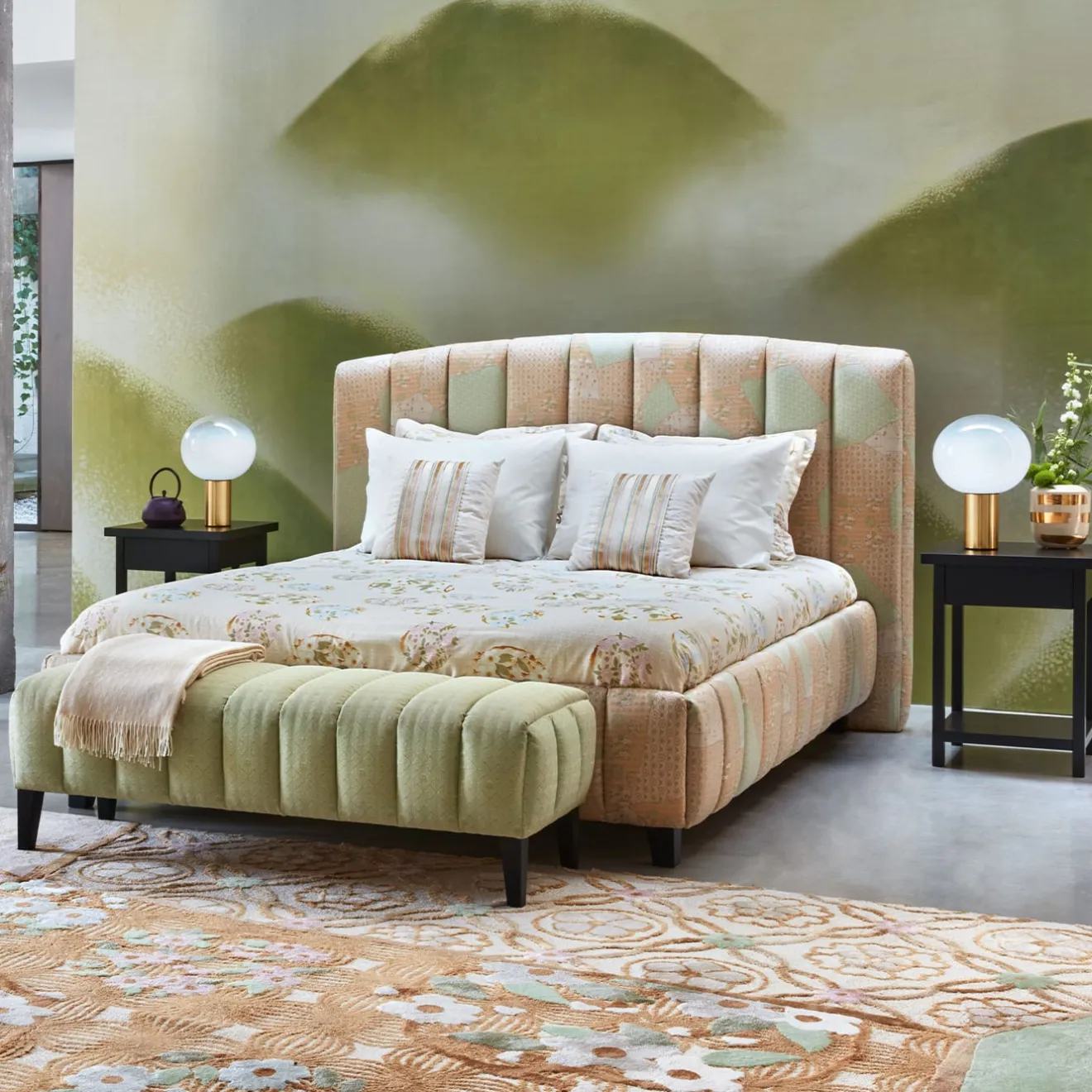 Una tavolozza squisitamente delicata esalta la straordinaria decorazione eclettica che caratterizza il design di questo sublime tappeto trapuntato a mano. Realizzato in lana e viscosa, presenta un semplice ma creativo patchwork di fiori in rilievo che rende omaggio al kintsugi, l’arte giapponese di riparare le ceramiche rotte con oro e metallo.