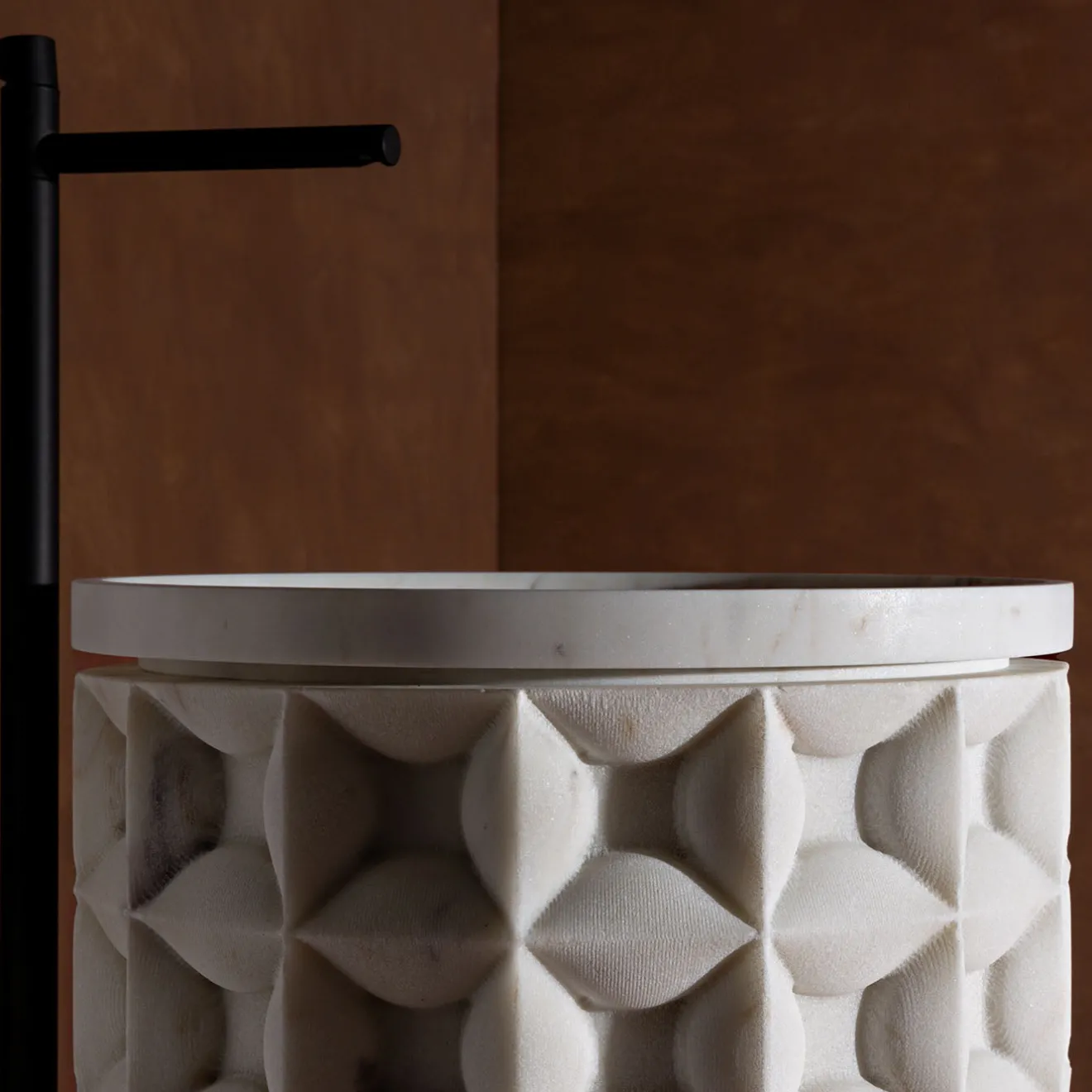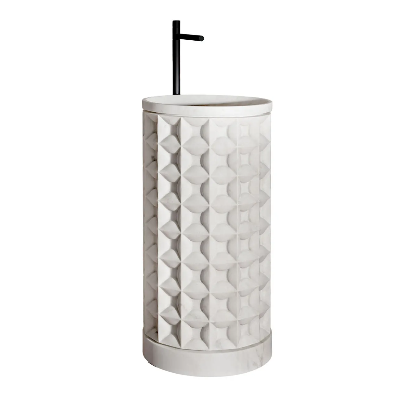 Il lavabo in marmo cilindrico freestanding ‘Dawn’ di Christophe Pillet presenta un blocco cilindrico scultoreo arricchito da una texture ornamentale a griglia tridimensionale sulla sua superficie esterna. Questo design è incorniciato da due bande lisce e lucide alla base e alla sommità, evidenziando il contrasto tra finiture testurizzate e raffinate. Il lavabo funge da elegante pezzo monolitico centrale, ispirandosi alla ricca tradizione del marmo italiano. Rubinetti non inclusi.