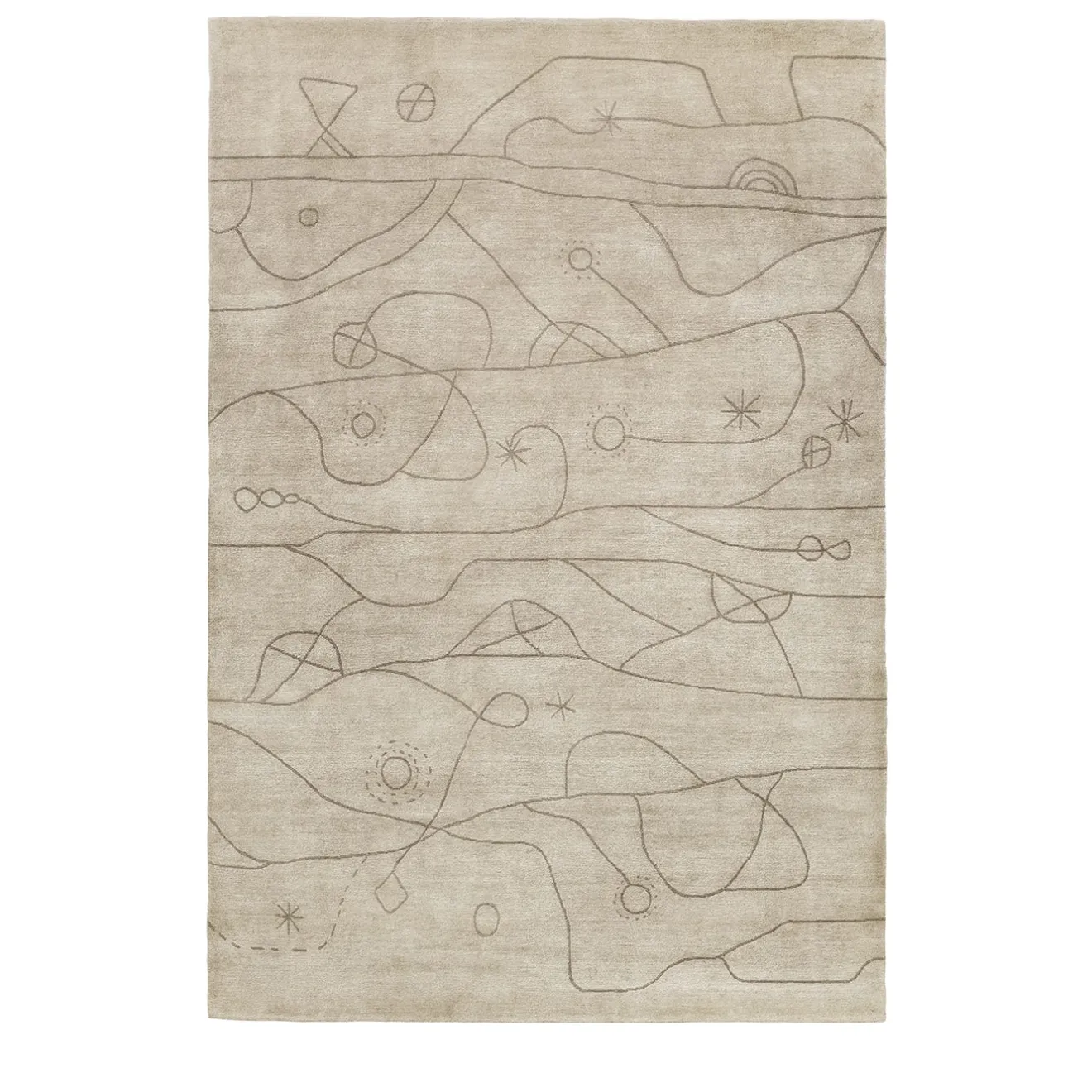 Annodato a mano in Nepal con una densità di 100 nodi, questo magnifico prodotto infonderà eleganza e fascino a qualsiasi arredamento moderno. Questo tappeto beige chiaro, con motivo grigio, è realizzato in lana filata a mano, lino naturale e seta di bambù e presenta un disegno naif di un paesaggio senza tempo.