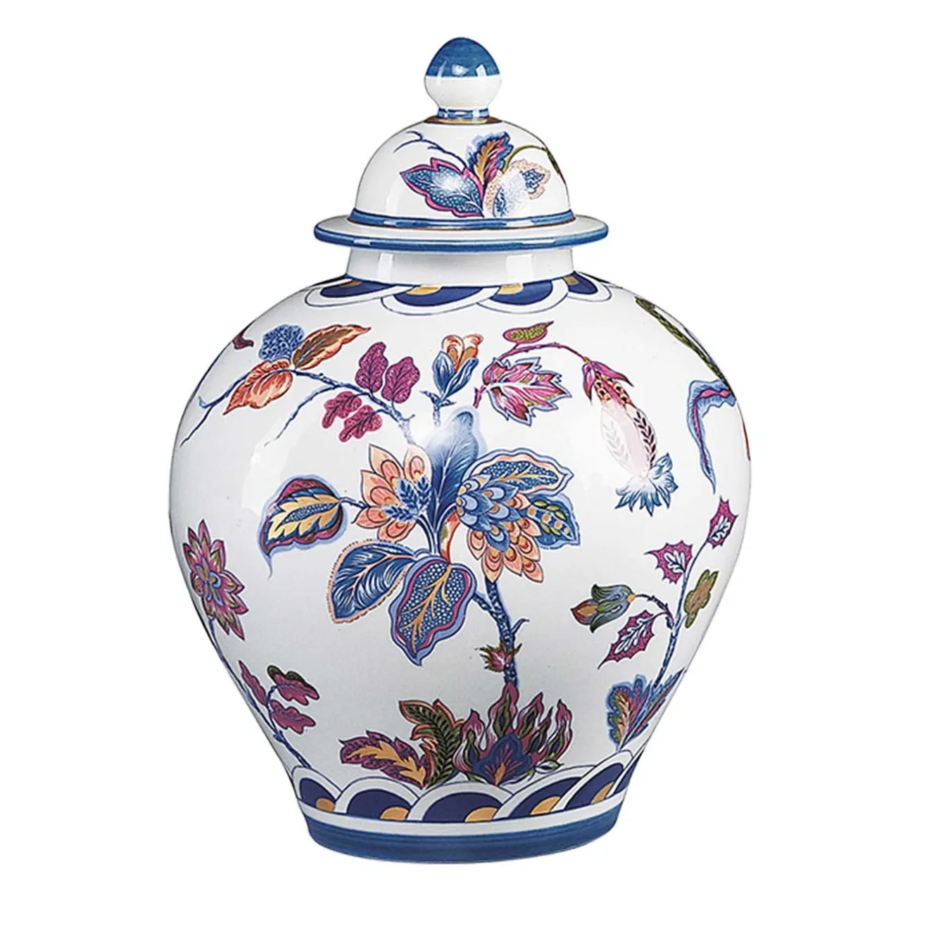 Questa sofisticata potiche in porcellana è intrisa di romanticismo e creatività. La sua silhouette sinuosa e rigonfia è impreziosita da decorazioni floreali che richiamano le calde tonalità dell’autunno, stagione a cui si ispira l’intera collezione. Un coperchio a forma di cupola, altrettanto decorato, con terminale sferico, completa questo prezioso oggetto d’arredo funzionale.