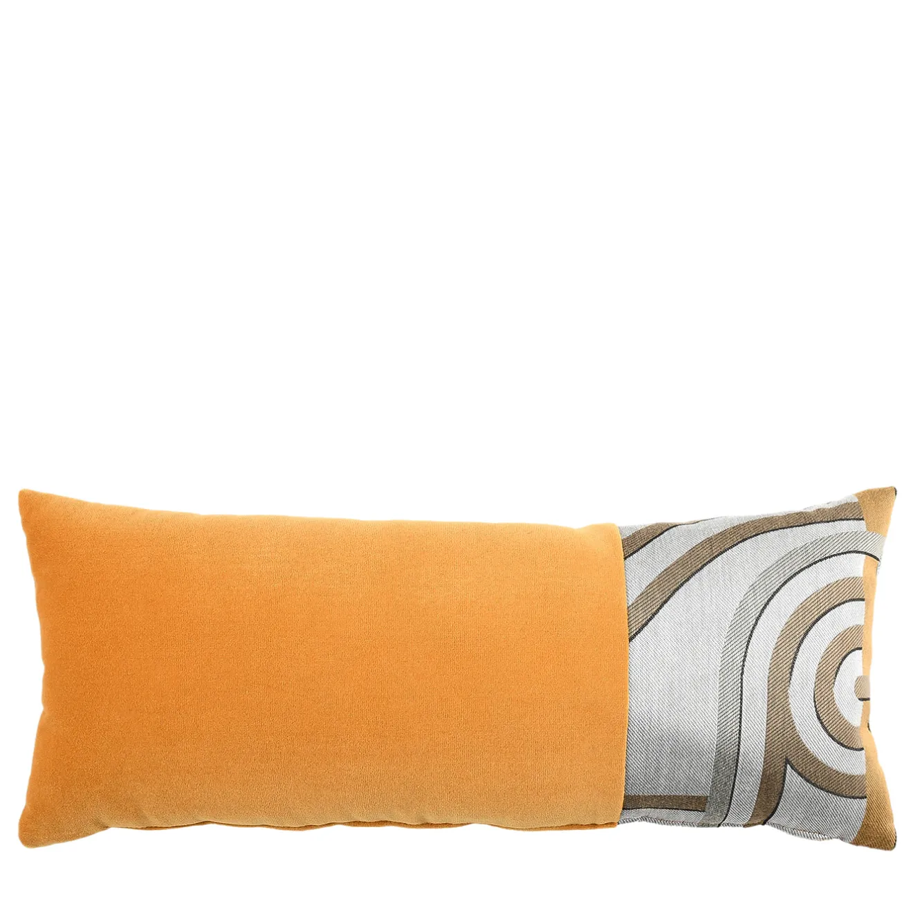 un cuscino decorativo rettangolare che presenta un contrasto sorprendente tra il morbido velluto giallo e il tessuto jacquard intrecciato in modo complesso con motivi circolari. progettato per offrire sia comfort che uno stile raffinato, arricchisce divani e letti con un look su misura. realizzato con precisione, questo pezzo fonde texture sofisticate e una palette di colori equilibrata per portare un accento sottile ma distintivo agli interni contemporanei.