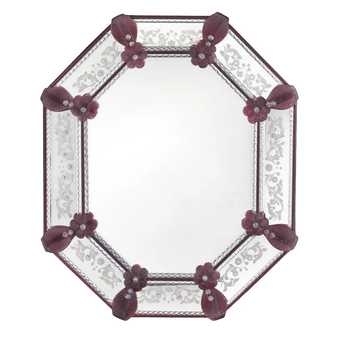 La tradizione trova un tocco di dolcezza nello specchio da parete Calle Crocetta. Con una pittoresca silhouette ottagonale, lo specchio è incorniciato in legno dipinto e impreziosito da incisioni in argento e fiori di vetro ad ogni angolo. Lo specchio può essere personalizzato sia nelle dimensioni che nel colore.