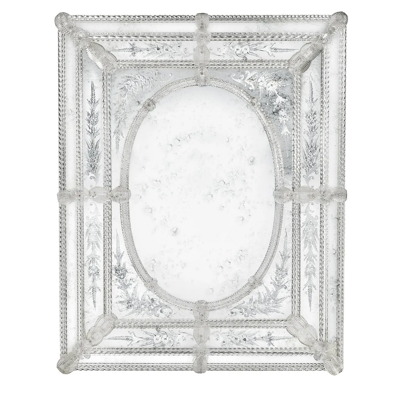 Testimonianza di secoli di know-how veneziano, lo specchio da parete Calle Tempio è uno stile senza tempo. Con una cornice in legno, lo specchio è impreziosito da incisioni floreali in argento e vetro trasparente. Il vetro anticato conferisce allo specchio un aspetto antico. Disponibile in diverse dimensioni e colori.