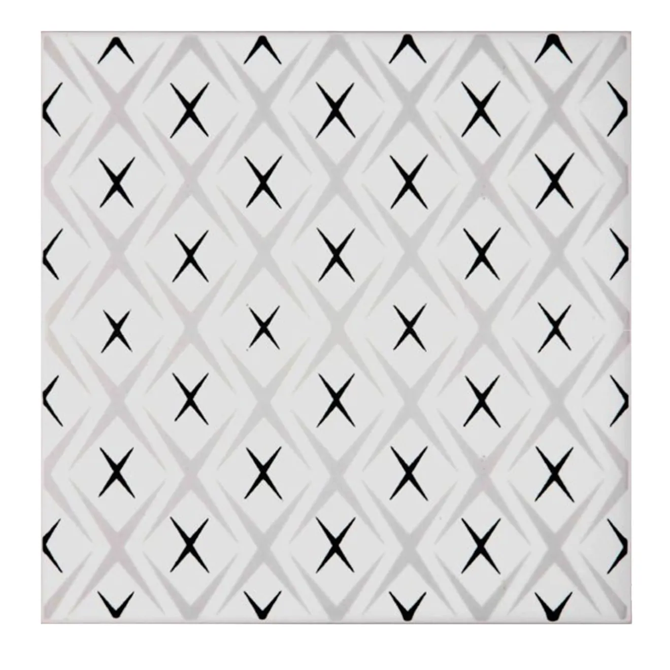 12 decori geometrici, serigrafati a mano su smalto satinato, coordinati con 12 colori di tendenza: una molteplicità di combinazioni per seguire le tendenze attuali o crearne di proprie. Le decorazioni sono prodotte nel formato 20×20, mentre i colori sono disponibili in tutti i formati. Colori personalizzabili. La finitura per interni su supporto ceramico è disponibile anche su Bianco Vietri semilucido e Bianco Cemento anche su gres porcellanato, finitura ruvida per esterni.