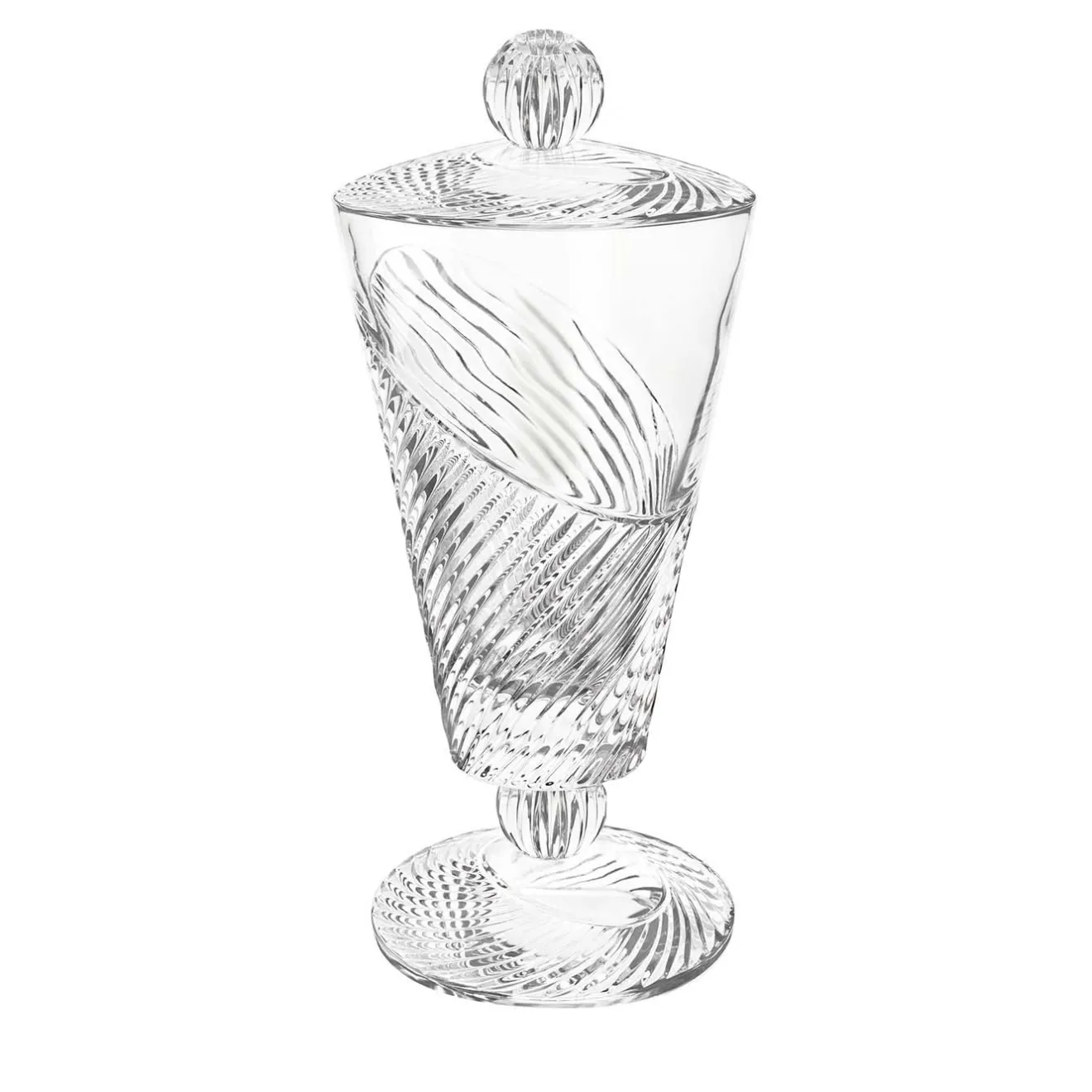 Questo vaso con coperchio, appartenente alla collezione Vertigo, è stato realizzato in vetro trasparente e presenta una forma a piede e una ciotola conica. La superficie liscia del pezzo è ornata da un decoro inciso che vanta una tensione dinamica grazie a una serie di linee irregolari che corrono in diagonale, racchiuse in dolci curve. Questo vivace oggetto d’arredo funzionale può contenere ed esporre una varietà di ninnoli e può essere abbinato ad altri articoli della stessa serie per un look completo.