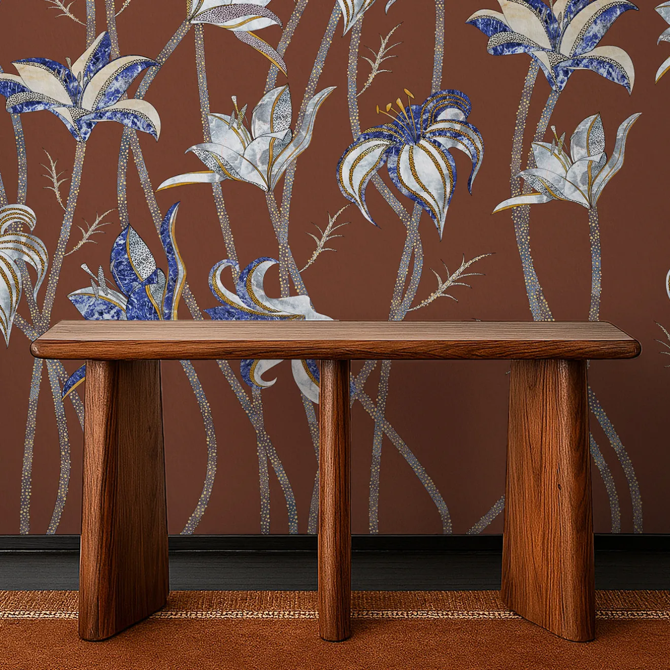 La carta da parati Fiori Terracotta raffigura lunghi steli sottili disegnati a mano che culminano in eleganti fiori di Lilium Lancifolium, ispirati all’antica tecnica decorativa della Scagliola. Questo metodo artigianale richiama l’aspetto di materiali preziosi come il Lapis Lazuli e il Quarzo Rosa, dando vita a un motivo sofisticato che fonde venature marmoree con suggestioni di pietre semipreziose. Stampata su carta ecologica di alta qualità in pura cellulosa con finitura opaca da disegno, fa parte della collezione Racconti. Il prezzo si riferisce al metro quadrato. Disponibile anche su altri supporti di stampa. Per ulteriori dettagli, si prega di contattare il Concierge. Design di Marika Tardio.