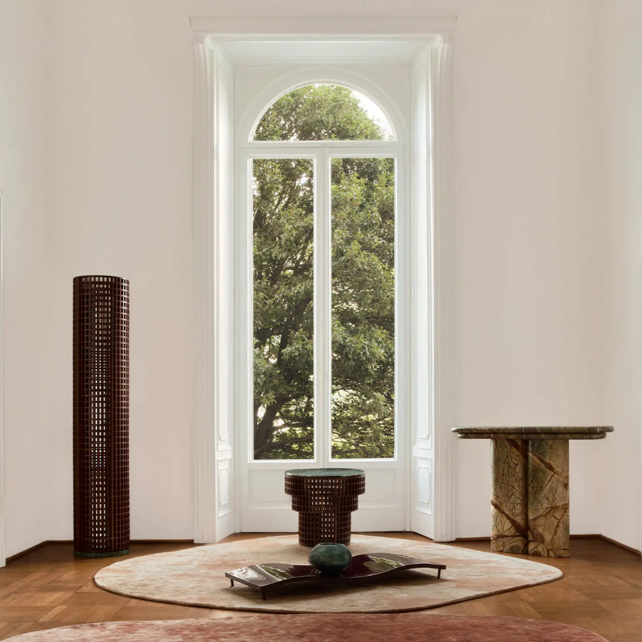 Specchio da terra in edizione limitata della collezione Carabottino, che presenta una distintiva griglia in legno bidimensionale con un motivo ritmico di intersezioni verticali e orizzontali. Il design gioca con pieno e vuoto, creando trame visive sovrapposte che evocano il movimento di un dipinto. Uno specchio curvo poggia su una solida base in marmo Verde Alpi, unendo componenti architettonici a materiali raffinati. La produzione è limitata a 10 pezzi in collaborazione con la galleria Calle Dei Cavalli.