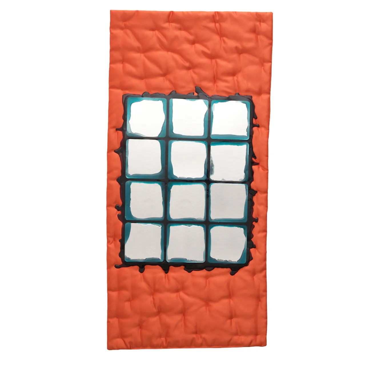 Mirror 3 di Gaetano Pesce è uno specchio da parete dal design sorprendente, ispirato ai pannelli delle finestre inglesi. Composto da dodici sezioni irregolari incorniciate da bordi scolpiti in plastica colata, è montato su uno sfondo in tessuto arancione dalla texture materica. Dotato di barra metallica per l’installazione, questo pezzo unisce materiali innovativi e un’estetica sperimentale, diventando un elemento scenografico per interni contemporanei. Edizione limitata di 30 pezzi.
