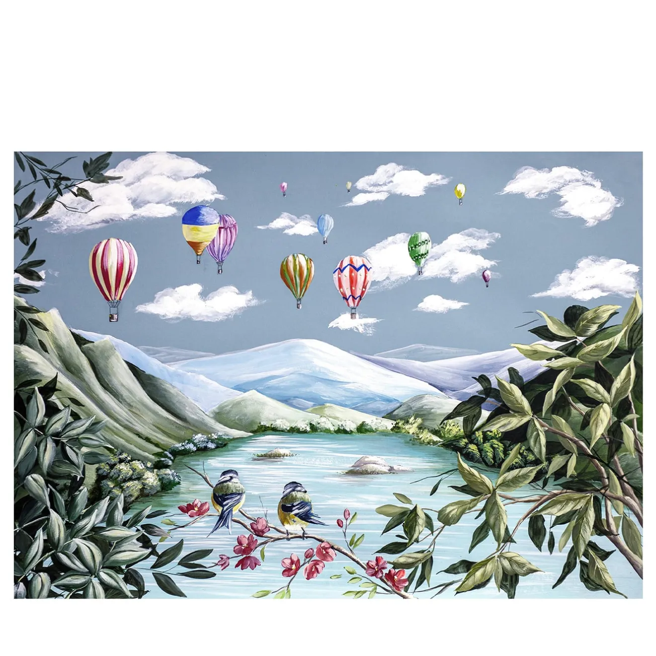 Questa decorazione murale è interamente dipinta a mano libera su una carta speciale. I colori e le dimensioni sono personalizzabili e il disegno si adatta alle dimensioni della parete o del pannello: può essere fissato su pareti o pannelli di legno. Per ulteriori informazioni e opzioni, contattare il Concierge.
