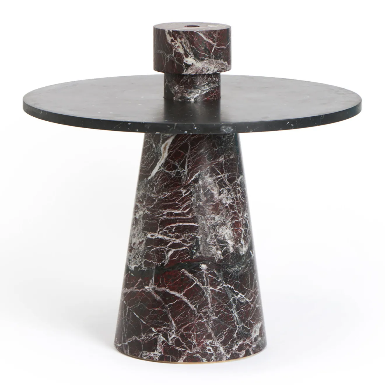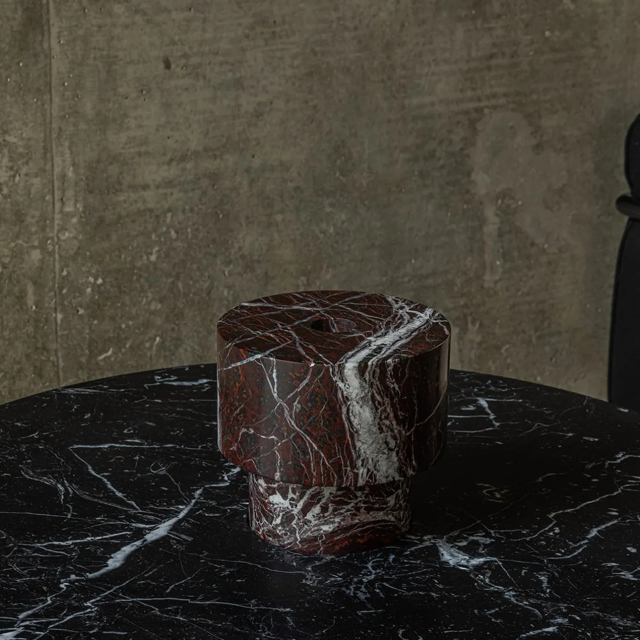 Questo raffinato portacandele, che emana un puro fascino scultoreo, è stato concepito da Karen Chekerdjian come accessorio complementare da inserire nei piani dei tavoli della Inside Out Collection. La forma minimalista ed evocativa in marmo rosso Levanto si distingue per le vistose venature che si estendono ai due cilindri impilati e di dimensioni diverse che compongono il corpo geometrico. Ogni candela è in grado di esaltare splendidamente le caratteristiche uniche di questo portacandele. Si prega di notare che i marmi e le pietre sono materiali naturali e possono differire anche se provenienti dalla stessa cava o dallo stesso blocco. Il prodotto mostrato può differire dagli articoli acquistati. Ogni pezzo è unico.