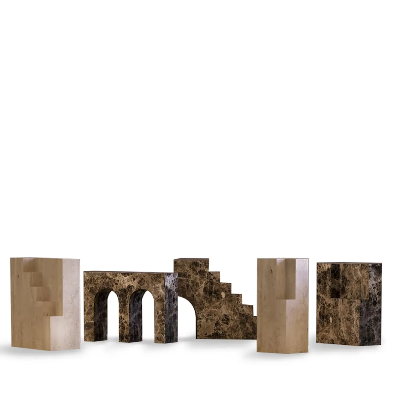 I paesaggi urbani e la loro architettura dinamica hanno ispirato la collezione City Sculptures di cui questo pezzo singolare fa parte. Idealmente abbinato a diversi disegni della stessa serie per creare composizioni intriganti e ricche, sfoggia un’ariosa silhouette a due archi in marmo Dark Emperador, naturalmente ornata da venature nocciola che emergono da uno sfondo marrone intenso. Nel catalogo Artemest è disponibile anche la versione in travertino.