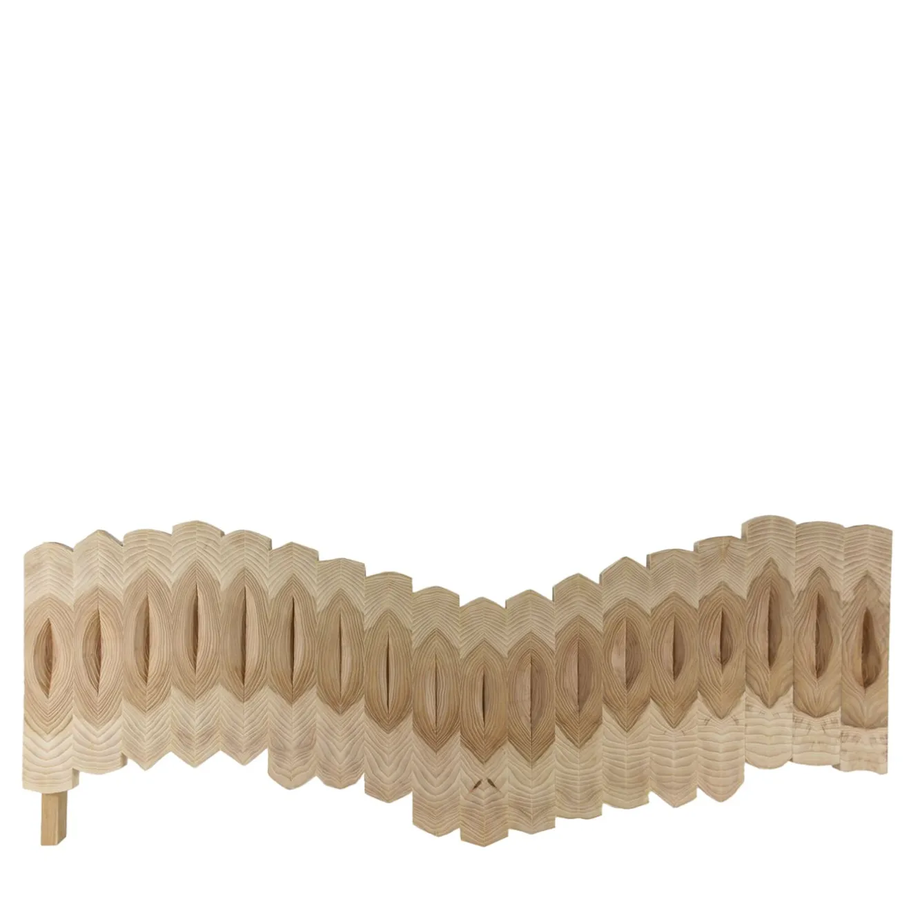 In questo suggestivo pannello decorativo, i tagli perpendicolari di un’unica tavola permettono di ottenere una serie di elementi disposti di conseguenza in una composizione dinamica. Non mancando di sedurre l’occhio con il suo motivo ripetitivo ma sempre mutevole, che deve la sua unicità all’uso esclusivo del legno naturale, il pezzo risulta da un assemblaggio dinamico secondo uno schema a coppie per massimizzare l’impatto visivo generale.
