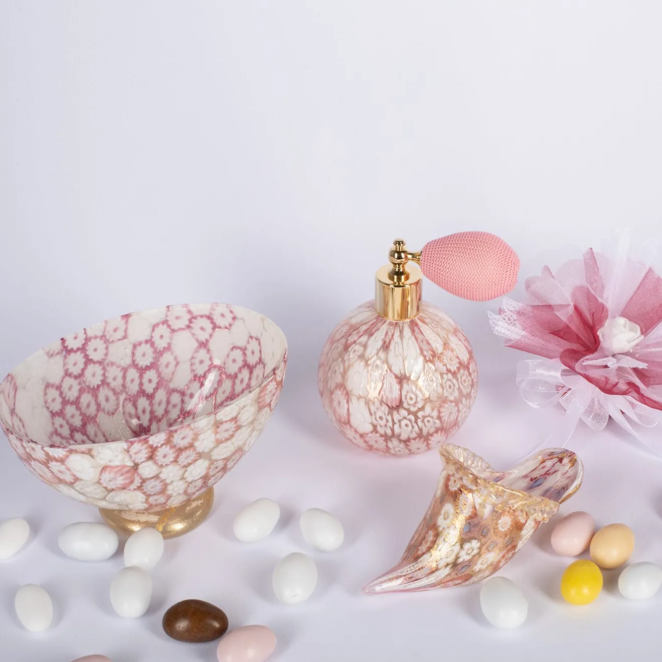 Un delicato e sofisticato flacone di profumo rosa con atomizzatore abbinato, che impreziosisce qualsiasi tavolo da toeletta e può essere utilizzato anche per contenere un deodorante per ambienti unici. Realizzato con la tecnica delle murrine e impreziosito da un motivo decorativo in foglia d’oro 24kt, è un modo straordinariamente chic per racchiudere le fragranze più eleganti.
