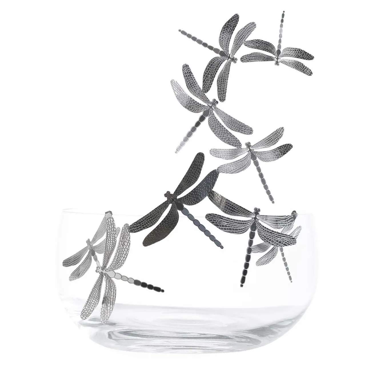 Disegnata da Gherardo Frassa per la collezione Frutteti, questa splendida ciotola è realizzata in cristallo di Boemia ed è decorata con libellule rimovibili in acciaio inossidabile lucido, la cui eleganza e grazia simboleggiano la libertà, “libertà” in italiano. Le libellule sono squisitamente dettagliate con delicate incisioni e sembrano volare sulla ciotola con le loro ali svolazzanti. Questo sofisticato pezzo di arredamento funzionale trasformerà un classico cesto di frutta in cristallo in un’opera d’arte da esporre su un tavolo da pranzo o una consolle per aggiungere un tocco romantico a qualsiasi interno.