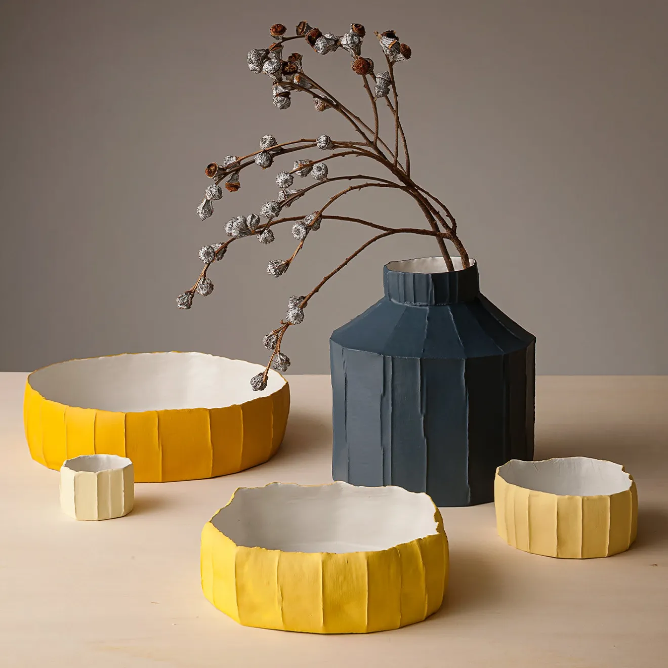 Ogni creazione di Paola Paronetto è unica. Lievi variazioni di forma, colore e dimensione sono da considerarsi garanzia di autenticità e valore. Sono rifiniti con smalti satinati atossici. Anche se molto raramente, è possibile che si verifichino perdite dopo una lunga esposizione all’acqua. È quindi consigliabile testarne la resistenza all’acqua prima di utilizzarli su superfici delicate. Non devono essere utilizzati come utensili da pranzo. I pezzi bianchi possono essere lavati con acqua o prodotti igienizzanti, mentre i pezzi colorati devono essere trattati con maggiore delicatezza e puliti con uno spolverino di piume o un panno morbido, asciutto o inumidito molto leggermente con acqua.