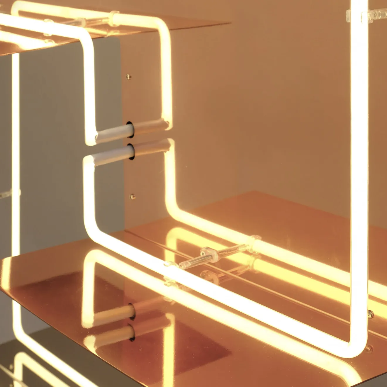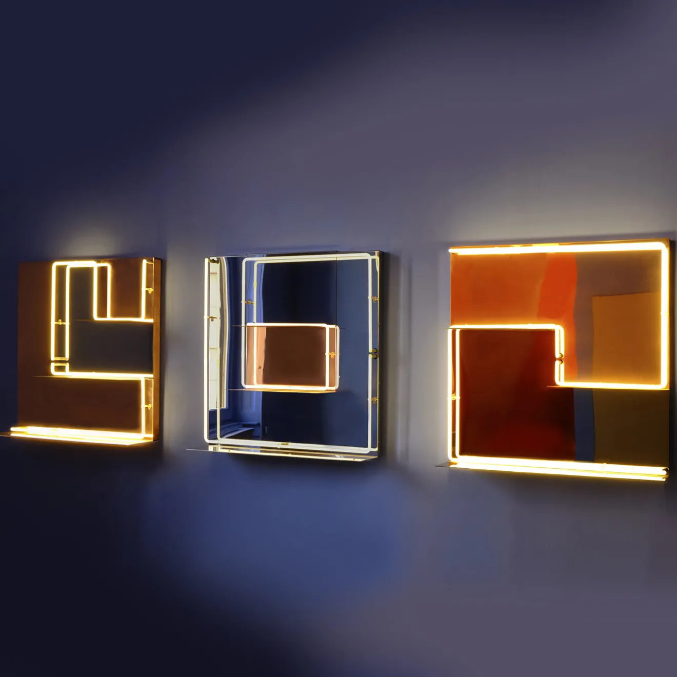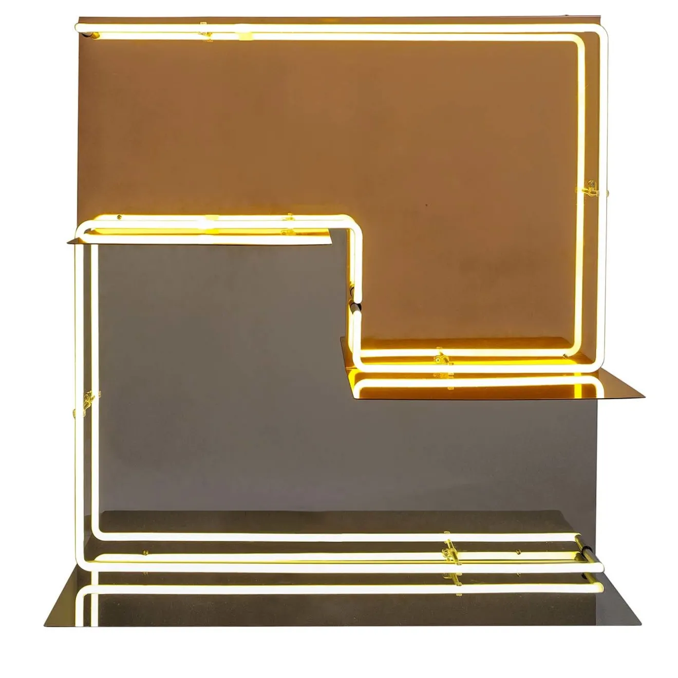 Disegnato da Paolo Giordano e Ouwen Mori nel 2019, questo dinamico pannello luminoso fa parte di un progetto in edizione limitata di 7 pezzi, realizzato in metallo e caratterizzato da pannelli dipinti, mensole, specchi e tubi di illuminazione. Giocando con i toni del grigio e dell’arancio, questo splendido pezzo offre un alto livello di raffinatezza e innovazione a qualsiasi arredamento in stile contemporaneo.