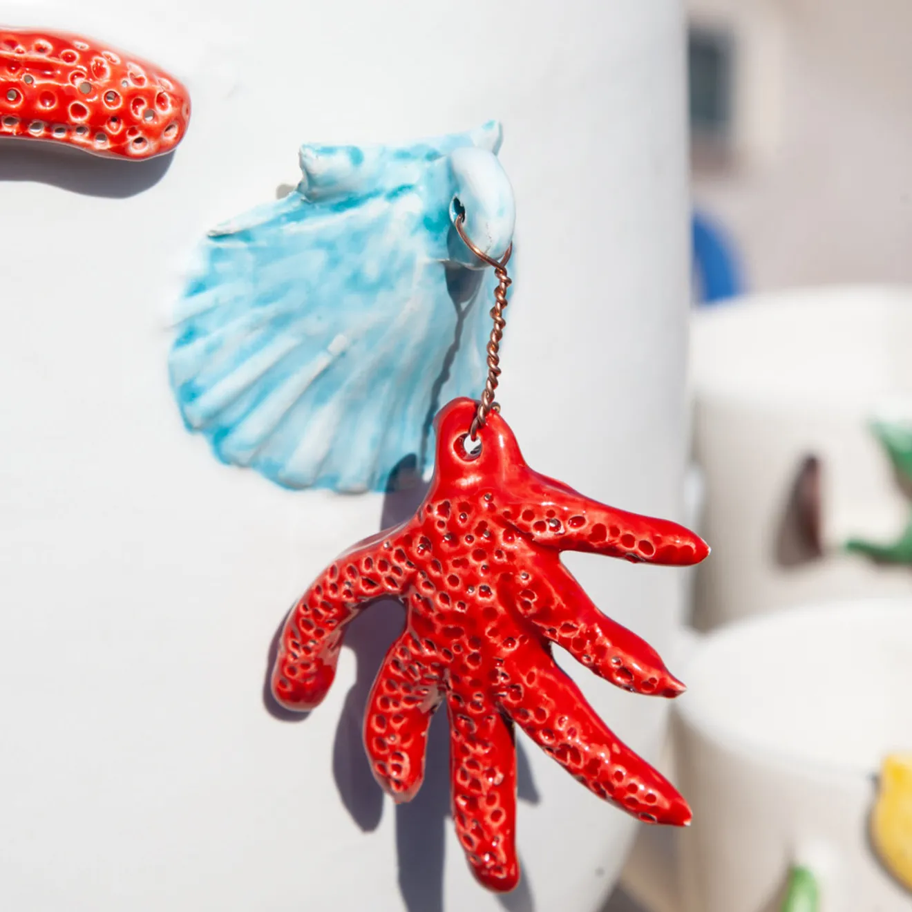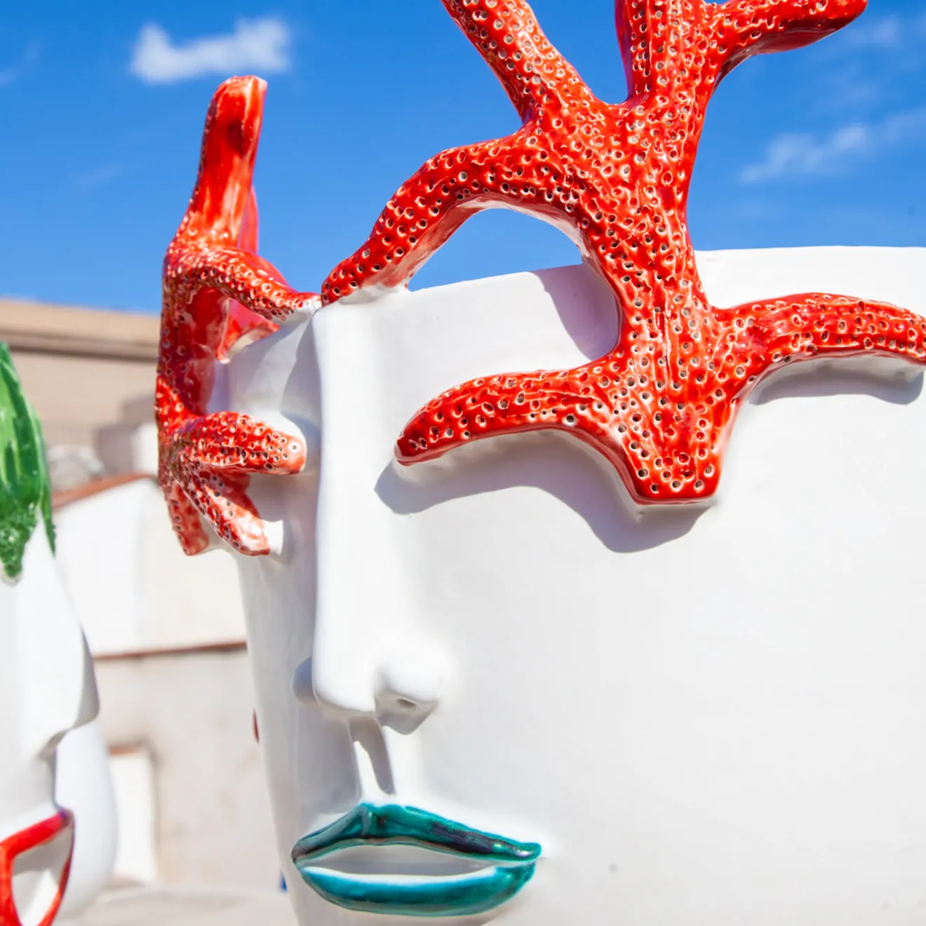 Questo design coinvolgente, che si inserisce perfettamente in una casa costiera raffinata, unisce la funzionalità di un vaso in ceramica pregiata al fascino visivo di un oggetto d’arte visionario. L’artista Patrizia Italiano realizza a mano la sua forma antropomorfa beige e la impreziosisce con dettagli colorati di ispirazione marina: orecchie a forma di conchiglia da cui pendono pendenti a forma di corallo sono accostate a elementi anch’essi a forma di corallo che sostituiscono oniricamente gli occhi. Le labbra sono accentuate da uno smalto color smeraldo.