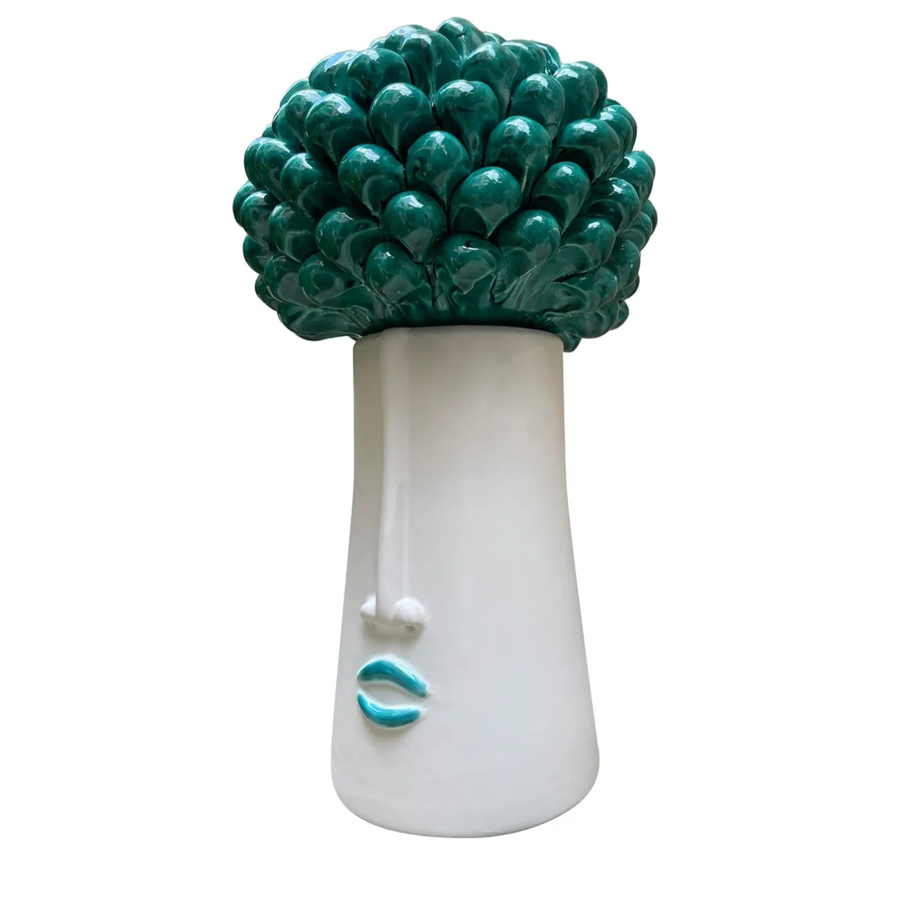 Splendido come centrotavola per una consolle d’ingresso, questo prezioso pezzo in ceramica emana un fascino romantico e scultoreo. I tratti antropomorfi accentuano il corpo centrale, sormontato da uno splendido coperchio a forma di pigna verde vivo. Dotato di un contenitore interno, il pezzo è una perfetta sintesi di praticità e stile.