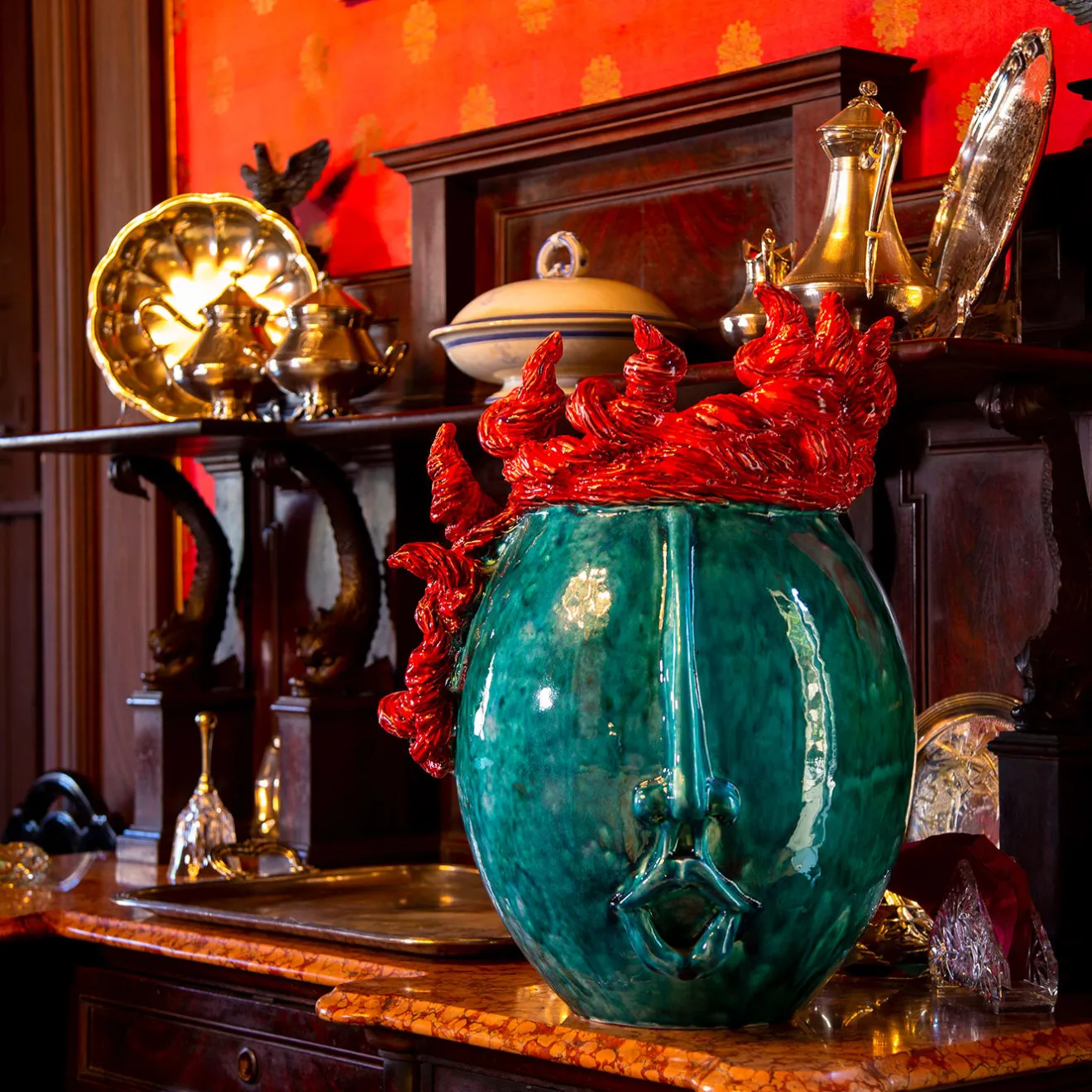 Questa testa scultura è dedicata al Fuoco, interamente realizzata a mano è lavorata con diversi intrecci, in argilla bianca e cristalli multipli colorati è cotta a gran fuoco per tre volte. Può essere utilizzata anche come porta piante o porta fiori.