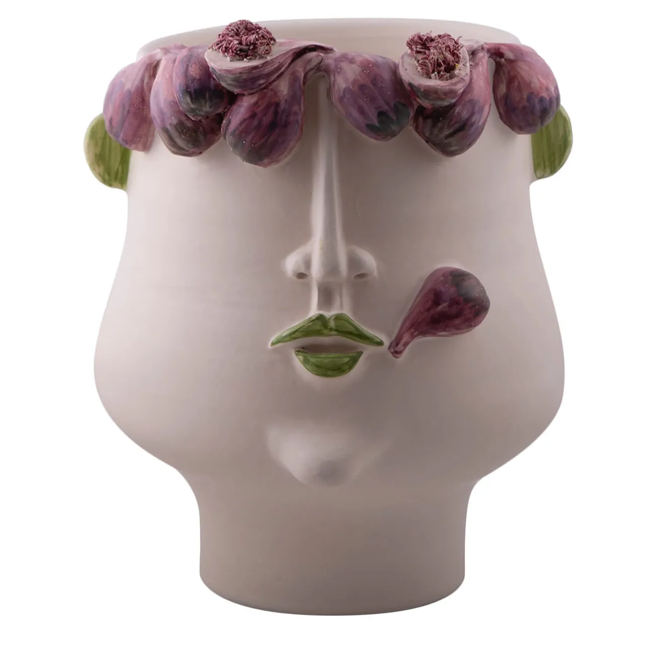 L’esposizione di questo lusinghiero vaso artigianale porterà un pizzico di folklore siciliano in qualsiasi raffinato contesto interno o esterno. Realizzato in ceramica fine smaltata in bianco opaco, la sua silhouette antropomorfa è stata ispirata da un venditore ambulante di fichi siciliano (“la ficazzana” in dialetto siciliano), il cui design è caratterizzato da fichi viola meticolosamente modellati e dipinti, disposti a corona intorno al bordo e giustapposti a un altro fico che adorna le labbra verdi.