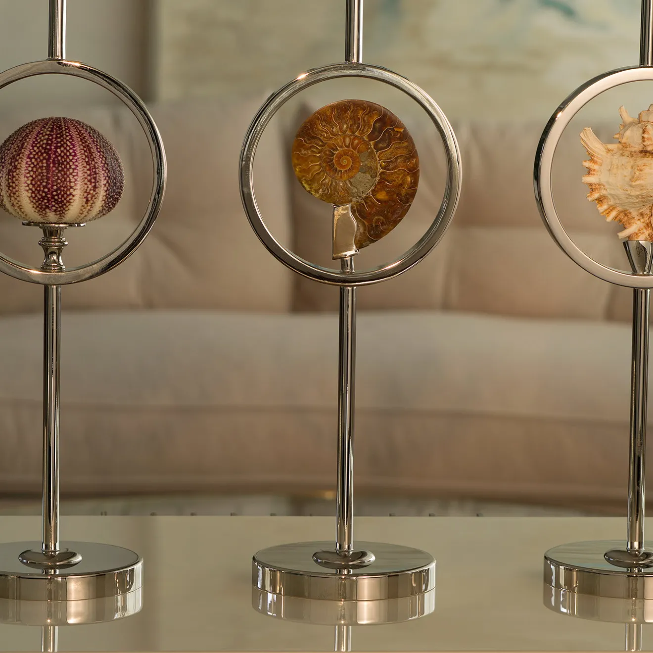 Moderno e antico si fondono in questo candeliere senza tempo che aggiungerà un accento glamour alla mensola del camino o alla console di un salotto, di una sala da pranzo o di un ingresso. Realizzato in ottone nichelato, il gambo sottile poggia su una base rotonda e culmina con un cerchio che incornicia un riccio di mare. Caratterizzato da un’estetica minimalista e da una combinazione testuale unica, questo candeliere fa parte di una serie di pezzi contemporanei che celebrano l’eleganza delle forme organiche.