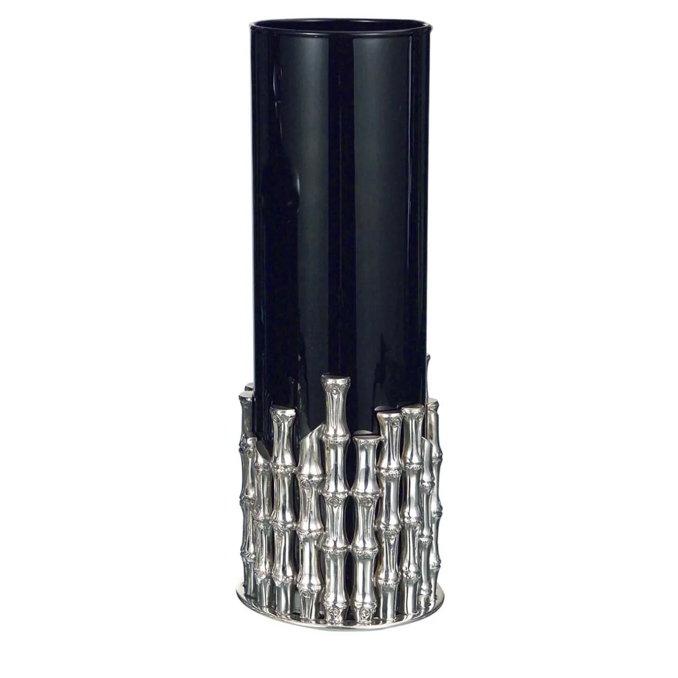 Questo squisito vaso è definito da un’accattivante combinazione di colori e texture. Il cilindro di vetro nero si trova all’interno di una base in argento 925 forgiata a mano a forma di canne di bambù che forniscono un supporto stabile e un accento decorativo di ineguagliabile eleganza. Questo vaso, che infonde raffinatezza anche quando non è ornato di fiori, sarà affascinante su una consolle d’ingresso o su un tavolo da pranzo del soggiorno dominato da una tavolozza monocromatica. Il vaso può essere facilmente rimosso per una facile pulizia.