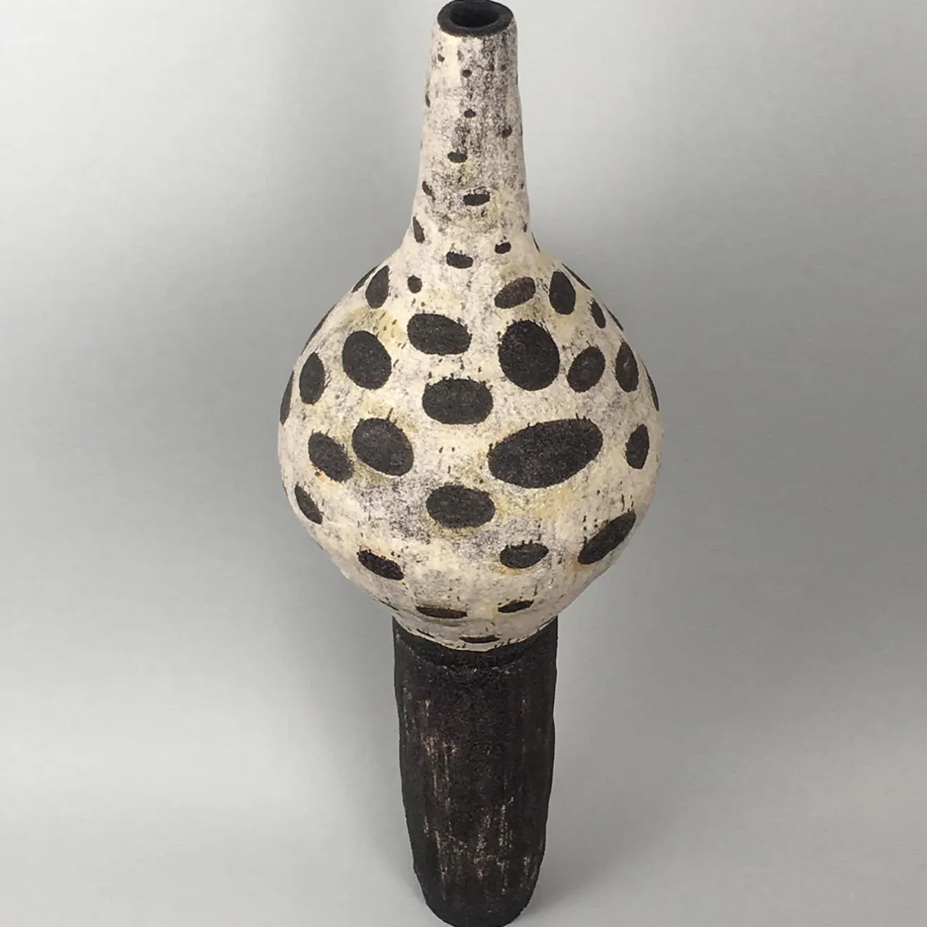 Ricco del fascino di un vero e proprio oggetto d’arte, questo vaso è una soluzione intelligente per ospitare fiori e sedurre con il suo aspetto scultoreo e irripetibile. Sapientemente lavorato e dipinto a mano, presenta una silhouette rigonfia al centro e drammaticamente affusolata alla base – accentuata in nero – e al collo, con una bocca (Ø 4 cm) che ricorda il cratere di un vulcano. Un motivo a puntini irregolari caratterizza la parte superiore, rifinita con smalto lucido e tratti grafici color manganese.