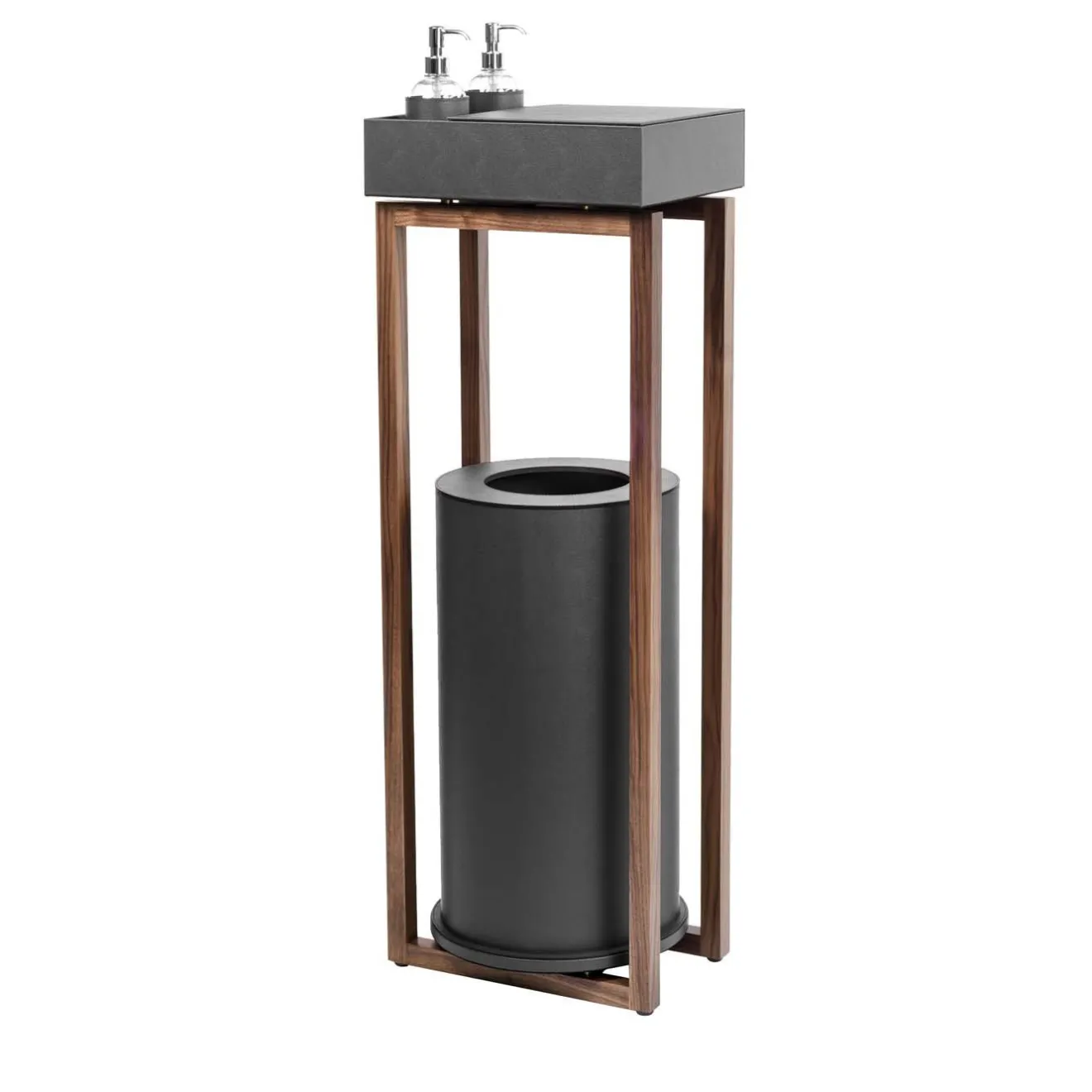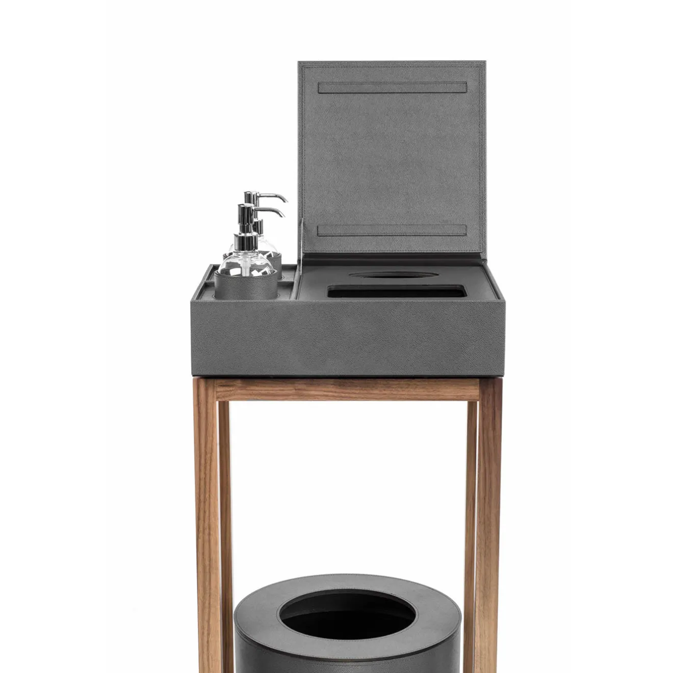 Questa raffinata postazione, che fa parte della Collezione Igea 2021 di soluzioni per l’igienizzazione di hotel, uffici e negozi, conferisce un’immediata eleganza e garantisce un ambiente pulito e privo di germi nelle aree ad alta frequentazione. Racchiusa in una base aperta in legno di noce canaletto, la grande pattumiera cilindrica sottostante e il vassoio scatolato con due dispenser di gel igienizzante ricaricabili sono rivestiti in pelle rigenerata grigia. La parte superiore si solleva per rivelare due scomparti per guanti e mascherine monouso.