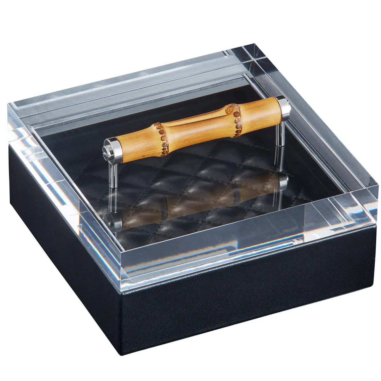 Questo elegante e versatile cofanetto rivestito in pelle, parte della Collezione Frida, è una testimonianza di raffinata artigianalità ed eleganza senza tempo. Vanta un coperchio in acrilico con manico in bambù e una fodera trapuntata con imbottitura a rombi.