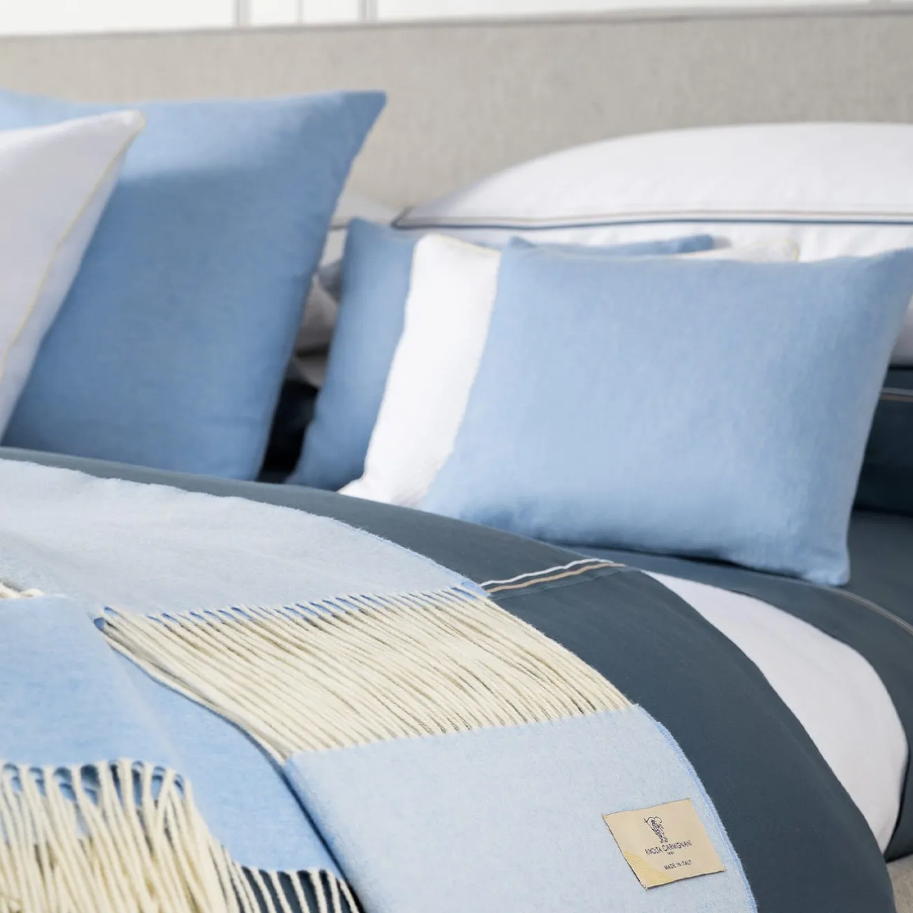 Proposta in una fresca palette che ricorda i cieli azzurro pallido velati da nuvole lattiginose, questa piccola coperta in 90% lana Merino e 10% cashmere appartiene all’esclusiva Collezione Defilé. I fili bianchi, in tinta con le frange, compongono il caratteristico disegno traforato, che si ispira a un antico metodo toscano di sfilare a mano i fili di lino dei corredi. Lavaggio solo a secco.