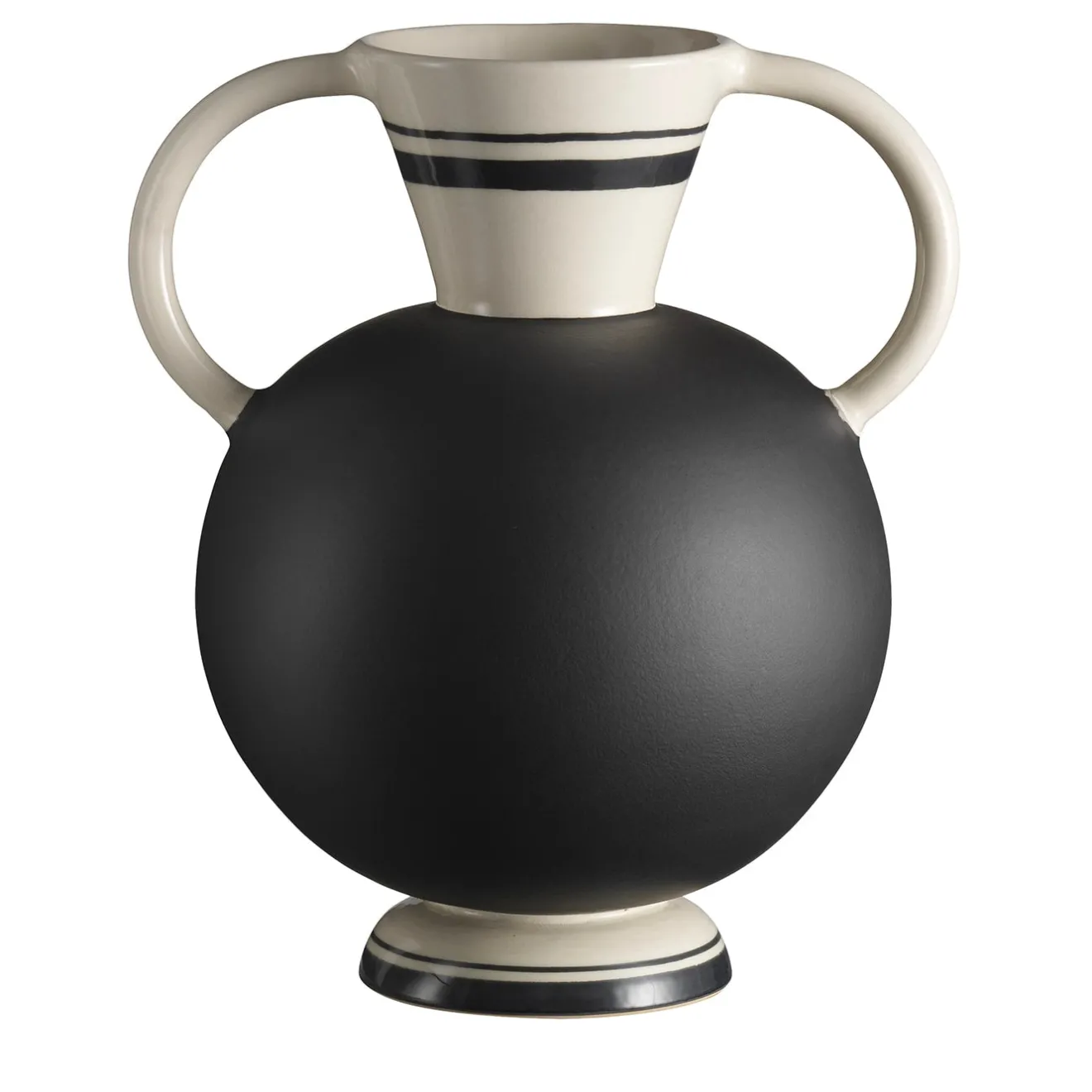 Vasi conici e sferoidali giocano con le linee in un rituale bianco e nero. Vaso in argilla, gettato a mano, con manici in argilla. Finitura in smalto nero opaco per il corpo, ingobbio bianco dipinto di nero con smalto trasparente per la base, la parte superiore e i manici Disegnato da Ugo La Pietra