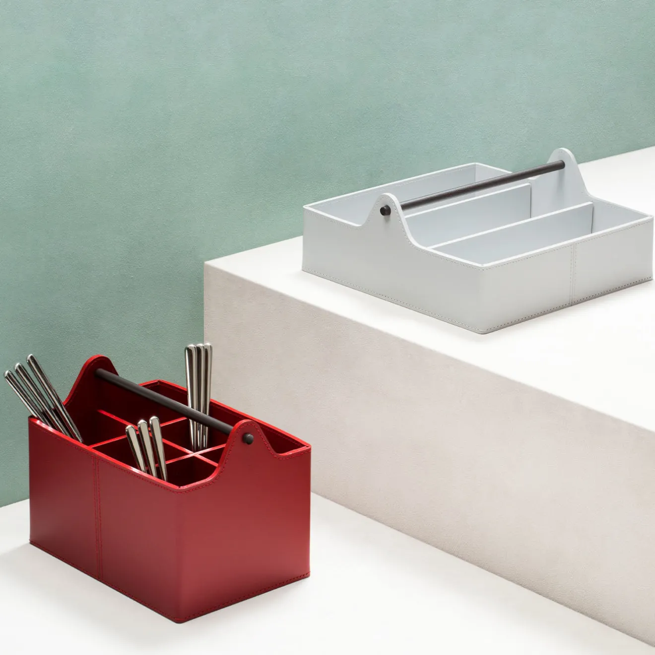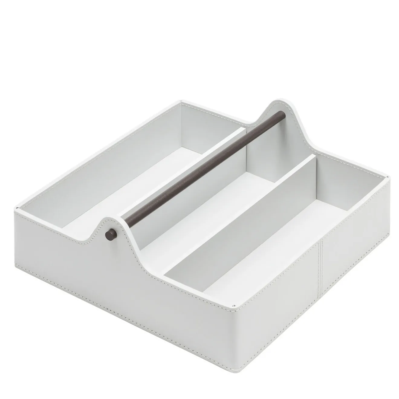 Finissimo cestino in cuoio rigenerato rinforzato con divisori, dotato di finitura impermeabile e resistente ai raggi UV. Presenta una caratteristica maniglia in metallo tinto scuro. Sono disponibili altri colori. Chiedere al Concierge per i dettagli.
