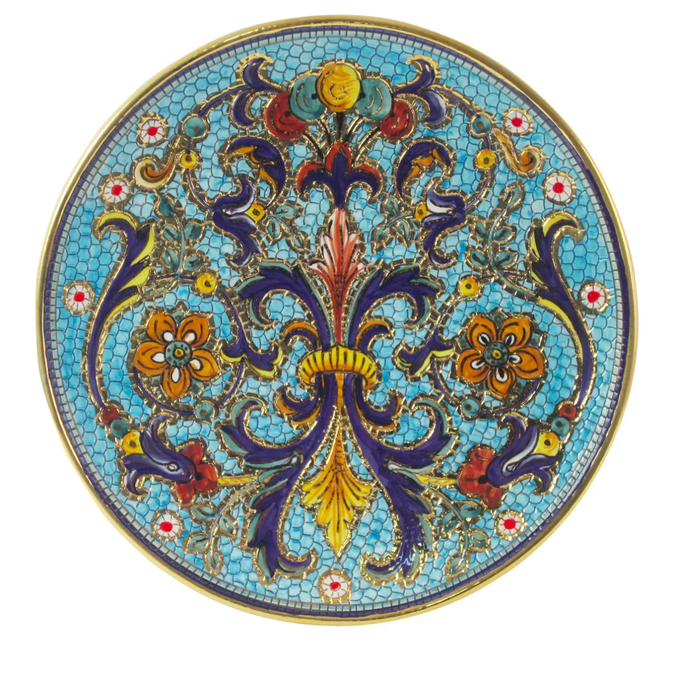 In onore della tradizione della ceramica di Deruta, questo elegante piatto rotondo amplificherà la raffinatezza di una sala da pranzo come singolare centro tavola. Realizzato in ceramica, questo piatto è decorato a mano con una tecnica sviluppata da Sambuco che ricrea la texture dei mosaici incidendo la superficie con uno strumento d’acciaio in una moltitudine di forme di piastrelle. I colori vibranti formano un vivace motivo floreale arricchito da accenti in oro zecchino. Questo splendido oggetto è sottoposto a tre cotture in forno, l’ultima delle quali fissa i colori nell’argilla.
