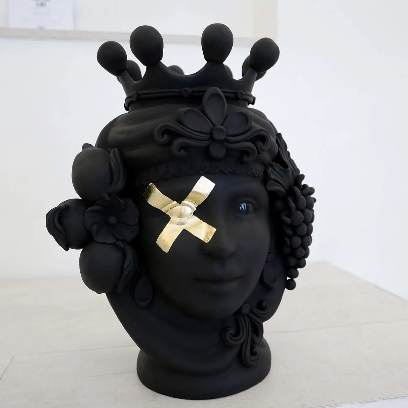 Sapientemente realizzato a mano dalla scultrice Stefania Boemi, questo vaso antropomorfo raffigurante una donna è un suggestivo omaggio alla ricca tradizione culturale della Sicilia. Il soggetto è tratto dalla tradizione siciliana, una storia d’amore e di vendetta tra un moro e una fanciulla risalente al periodo della conquista musulmana. Realizzato in terracotta con uno smalto nero opaco, un accento a forma di X in foglia d’oro copre l’occhio destro, sottolineando lo sguardo accattivante. La ricchezza dei pigmenti naturali, che ricordano le rocce vulcaniche della Sicilia, esalta l’intensità del colore e i minuziosi dettagli scultorei che rendono questo pezzo unico. Il vaso non può essere riempito d’acqua.