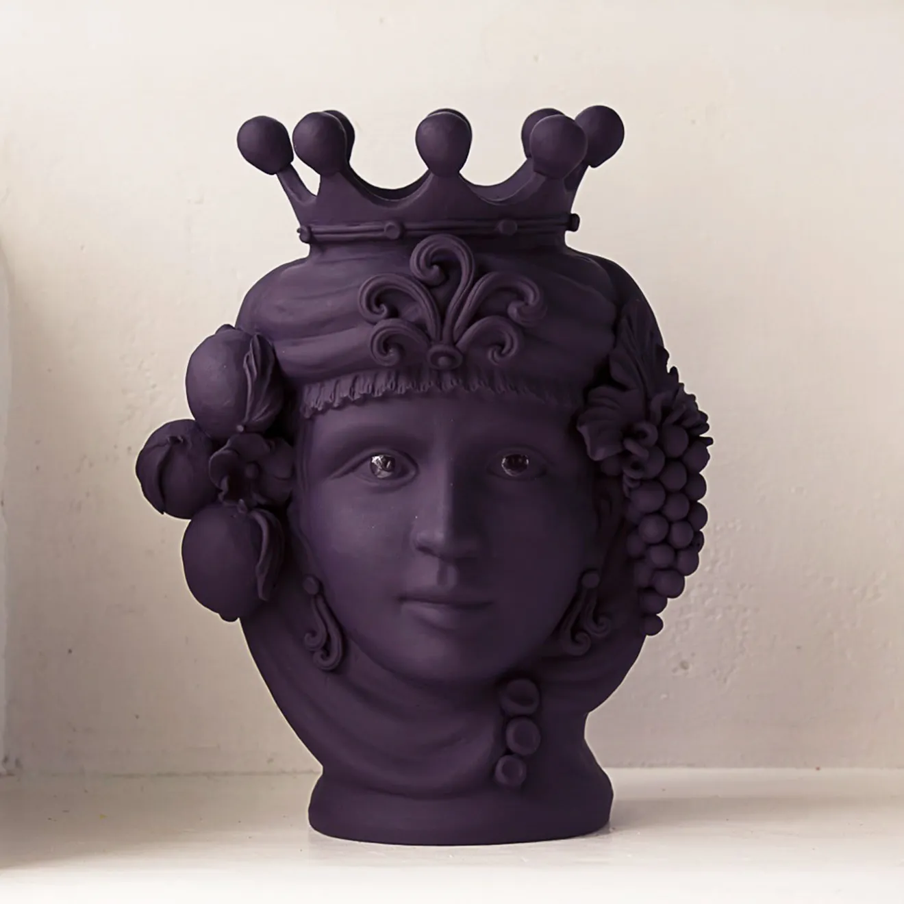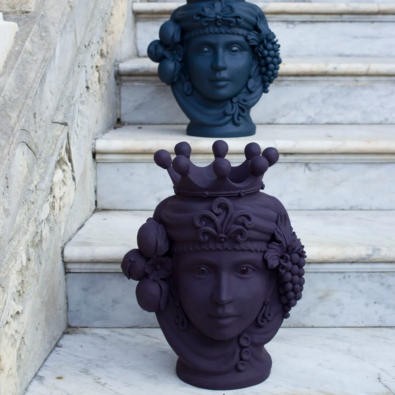 Questo vaso antropomorfo è realizzato interamente a mano e dipinto in una tinta monocromatica opaca bordeaux scuro, ricca di pigmenti naturali e leganti resinosi che conferiscono un’intensa profondità cromatica. Solo gli occhi sono smaltati per farli risaltare, enfatizzando la bellezza dello sguardo. Il pezzo si ispira alle antiche leggende siciliane di amore e vendetta tra un moro e una fanciulla. Il vaso non può essere riempito d’acqua.