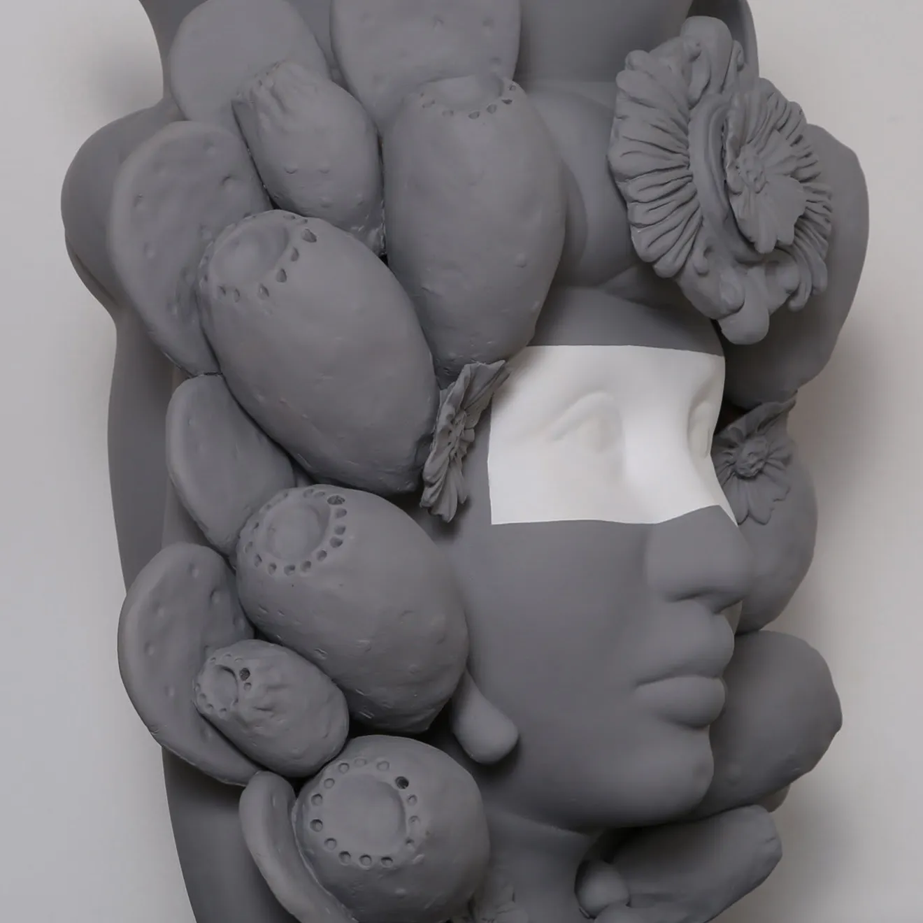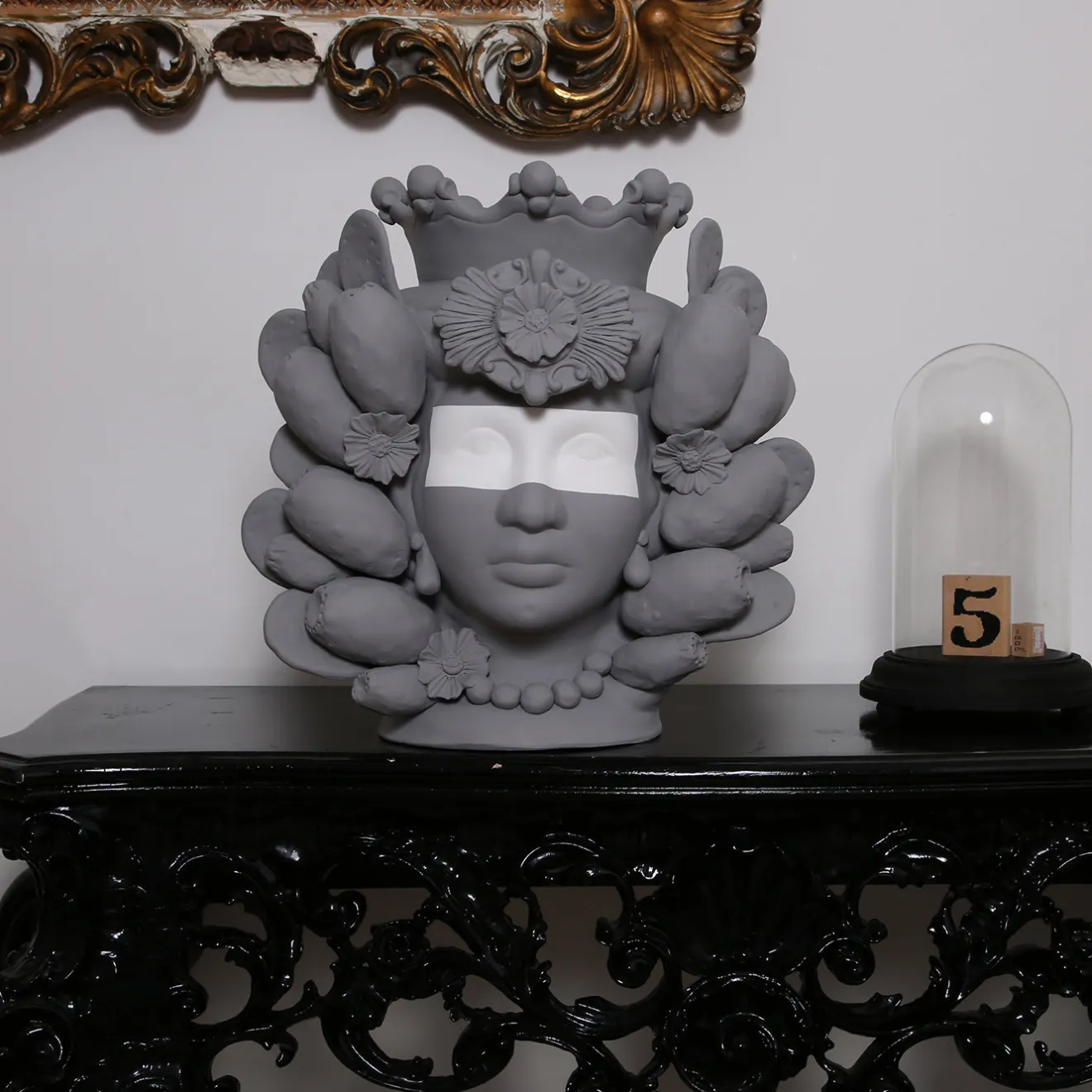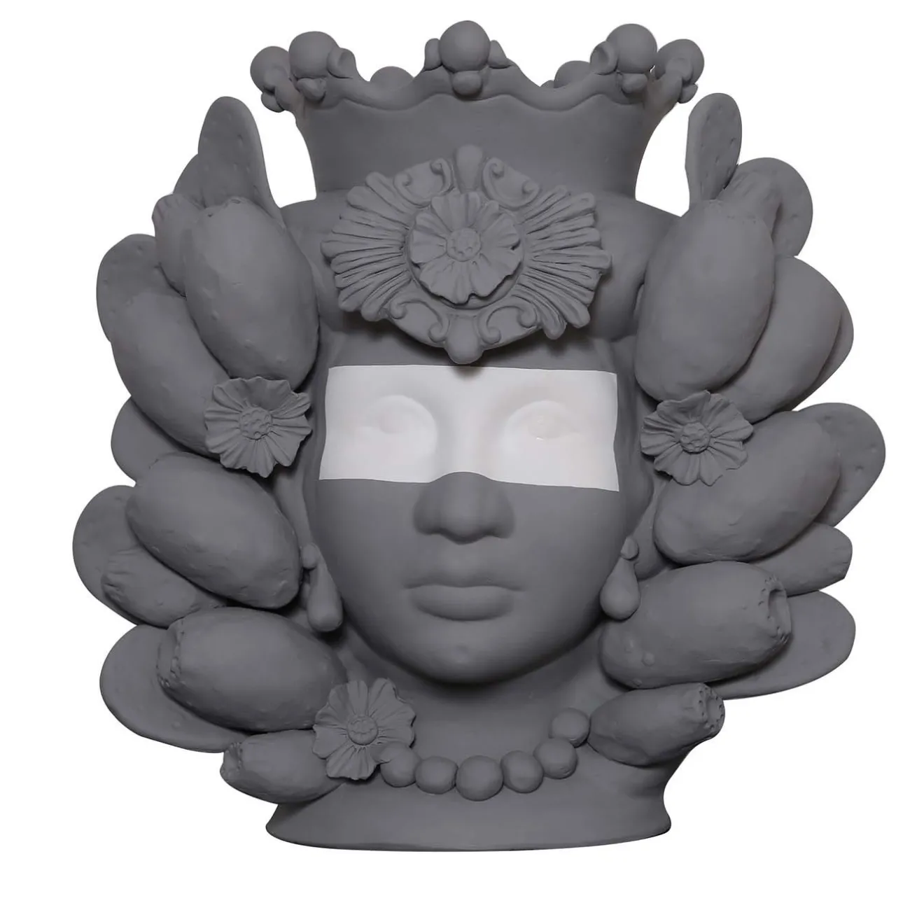 Questo eccezionale vaso moresco raffigurante una donna è realizzato secondo l’antica tradizione siciliana della terracotta. Il vaso antropomorfo è eccezionale nei dettagli, come dimostra il copricapo ornato di limoni che incornicia elegantemente il sontuoso volto della donna. Dipinto a mano con uno smalto grigio opaco, questo pezzo vanta una fascia bianca attraverso gli occhi, un tocco moderno che accentua la drammaticità del vaso. Il vaso non può essere riempito d’acqua.