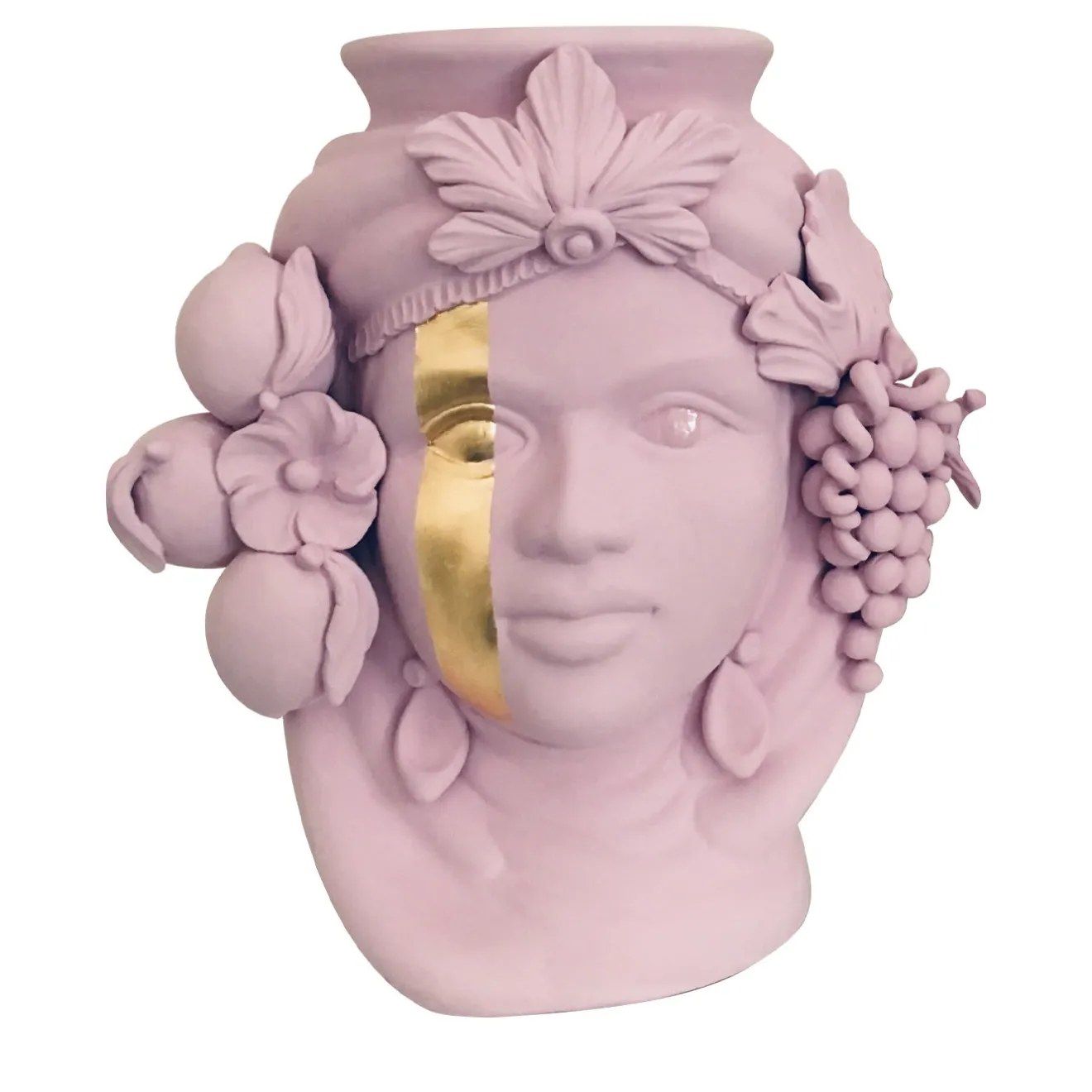 Moderna interpretazione di un tradizionale busto di moro siciliano, questo vaso scultura è squisitamente realizzato a mano in argilla rosa. Il pezzo rappresenta i tratti morbidi e delicati di un volto di donna ornato di fiori e frutta e una foglia d’oro verticale che esalta il lato sinistro del volto. Il vaso non può essere riempito d’acqua.