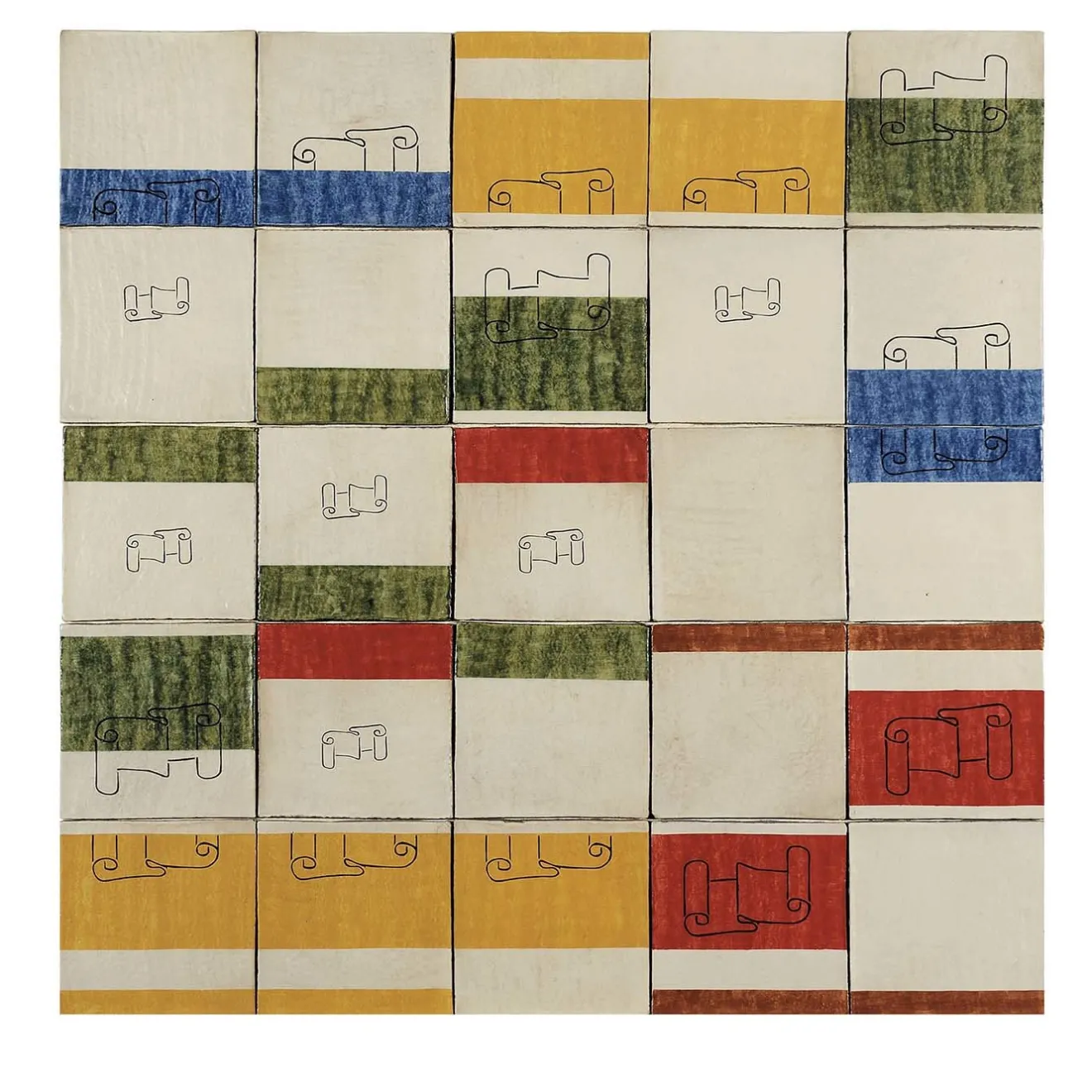 Rivisitazione creativa di forme classiche, questo stravagante pannello in maiolica dello Studio Le Nid sarà un’aggiunta eclettica a qualsiasi casa in stile moderno. Realizzato a mano e smaltato, questo eccezionale pannello di 25 piastrelle è realizzato in terracotta con pietra vulcanica e vanta un suggestivo motivo a volute di carta in contorno nero con accenti colorati a blocchi in smalti rossi, verdi, arancioni e blu. Montato al meglio con una stuccatura minima per garantire la continuità del design, questo pannello si presta a infinite configurazioni in cucina, in bagno, nella stanza della polvere o nella zona del patio.