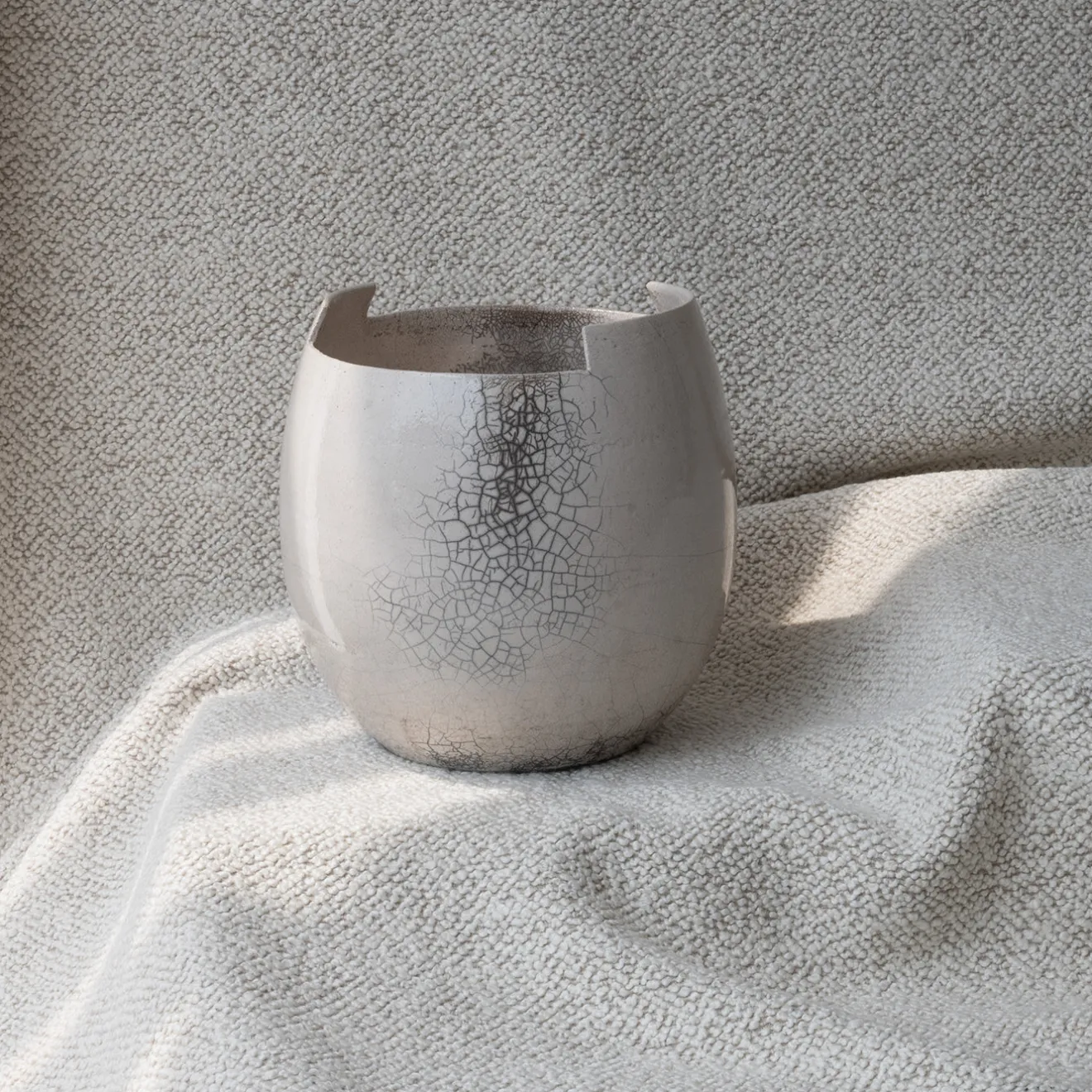 Caratterizzato da tagli netti eseguiti direttamente sulla ruota, il vaso in ceramica trasparente raku cut small incarna un design minimalista ispirato all’estetica giapponese, dove ha origine la tecnica raku. Questo metodo accentua la bellezza della semplicità, creando modelli e toni unici di crepe attraverso effetti di smaltatura e fumo durante la cottura. Abbracciando l’ideale wabi-sabi, il vaso celebra l’imperfezione e il passare del tempo, rendendo ogni pezzo visivamente distinto. Si abbina a interni contemporanei e sereni.
