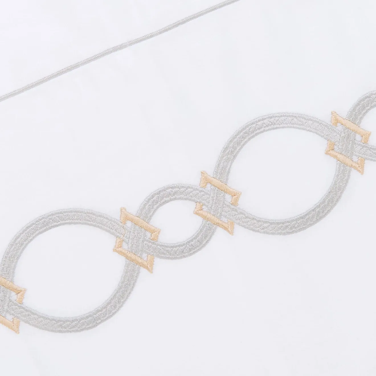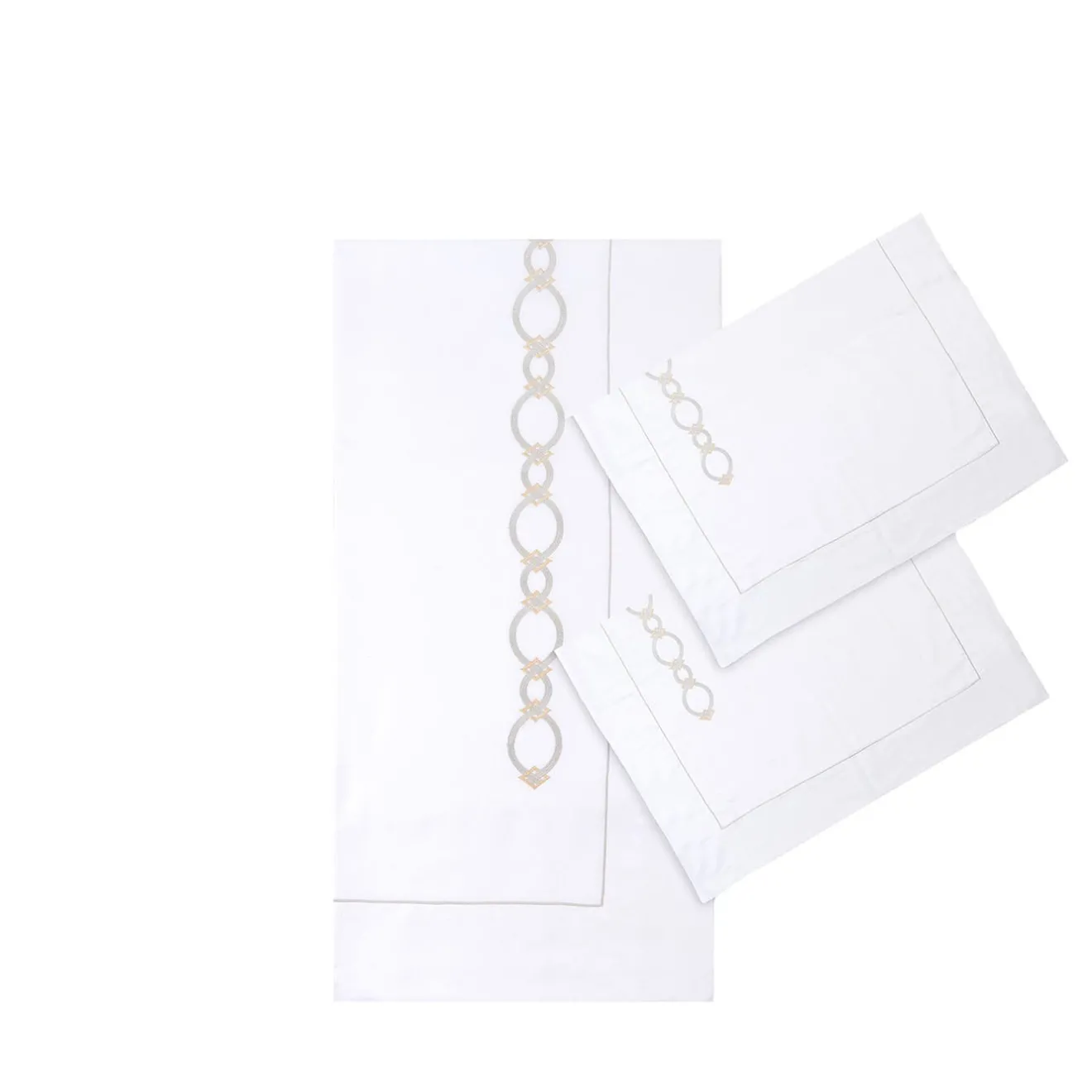 Dotato di un lenzuolo superiore (270×300 cm) e di due federe abbinate (50×80 cm), questo set di biancheria da letto incarna un’artigianalità raffinata con ricami intricati su cotone sateen a 300 fili. Il motivo circolare aggiunge un’estetica contemporanea ma morbida, armonizzando lusso e comfort per un sonno riposante. Perfetto per trasformare la camera da letto in un rifugio sereno, grazie al suo colore bianco e alla sua raffinatezza tattile.