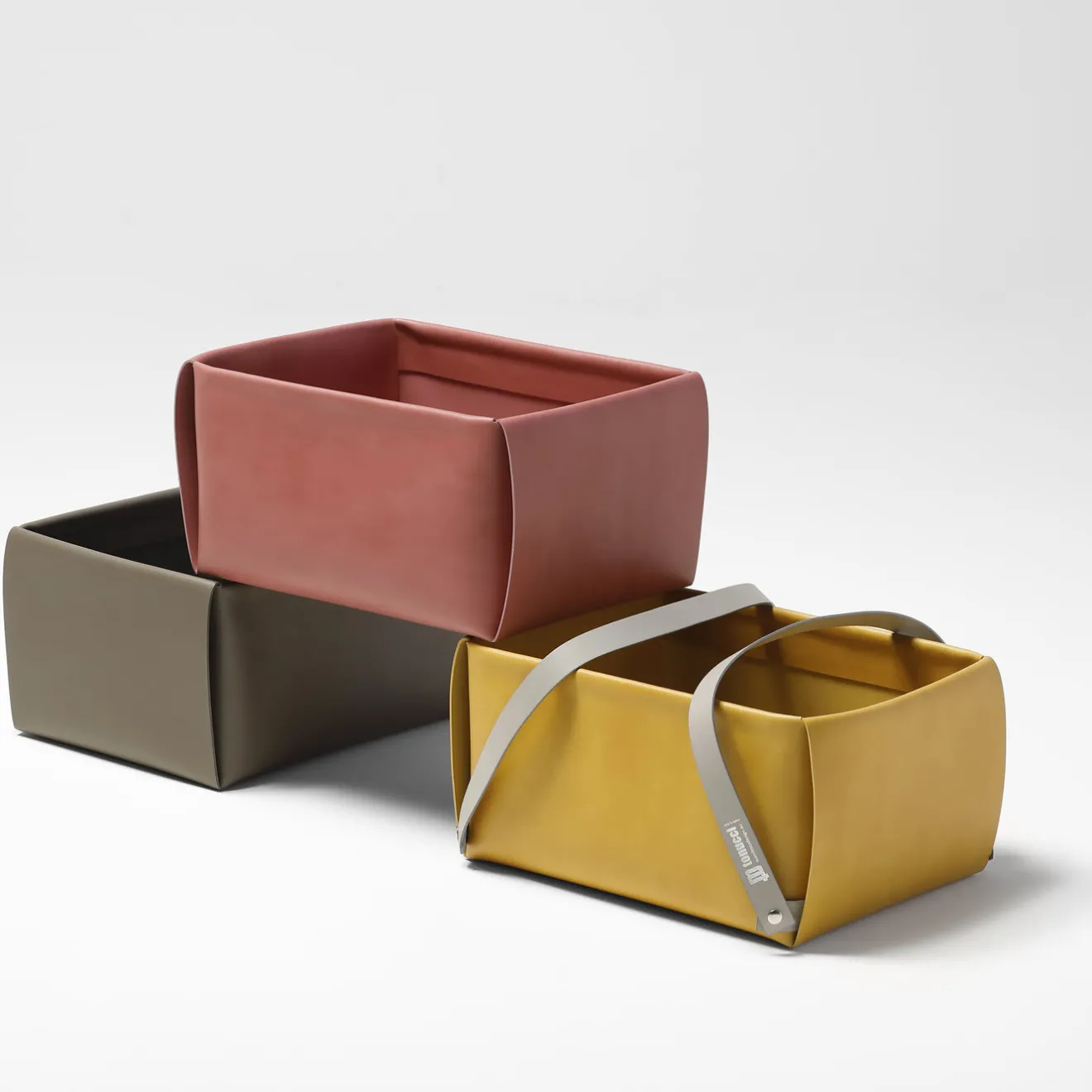 Questo pratico ed elegante cestino è l’organizzatore perfetto per contenere riviste, coperte, cuscini e una serie di piccoli oggetti accanto al divano del soggiorno, asciugamani in bagno o cappelli e guanti all’ingresso. Ispirato agli origami giapponesi, questo cestino è formato da un unico foglio quadrato di pelle giallo pallido trasformato in una scatola tridimensionale attraverso una tecnica di piegatura e scultura. Due cinture in pelle color tortora sono fissate agli angoli inferiori e fungono da maniglie per spostare facilmente il cestino dove necessario.