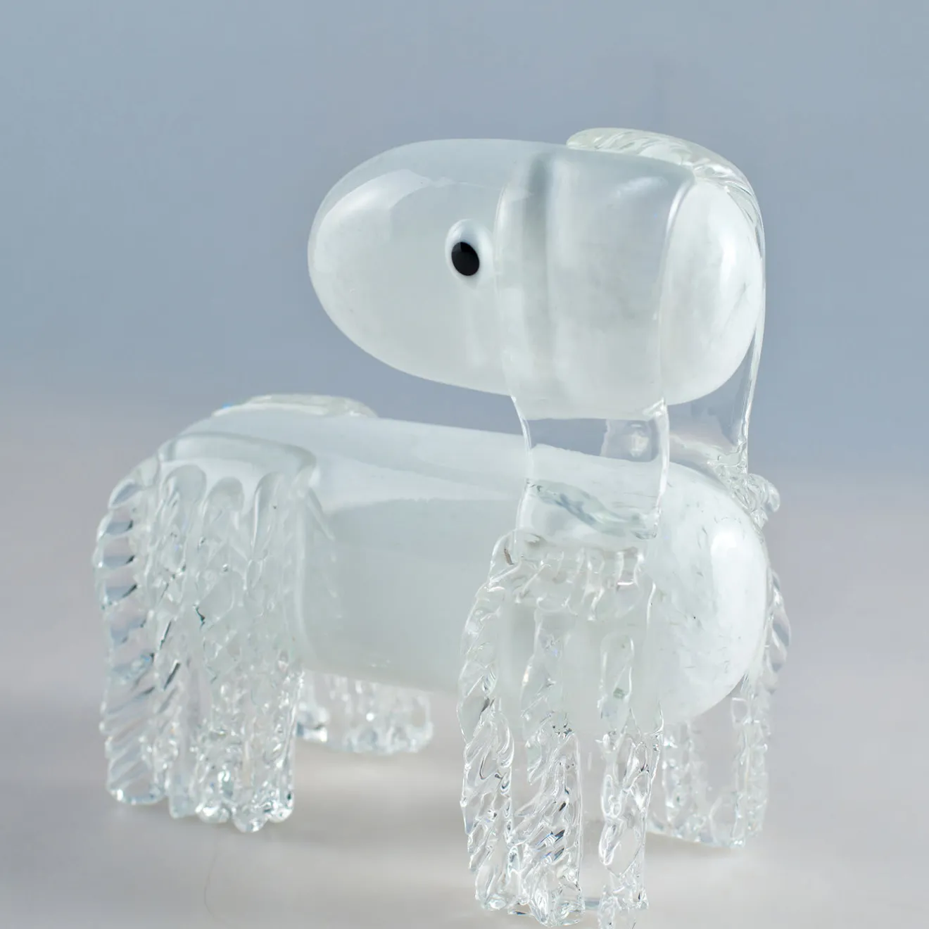 Come per i cani veri, una volta preso in mano questo pezzo, sarà vostro per sempre. Ispirato alla scultura animale in vetro di Murano degli anni Venti, questo cane poggia su zampe di vetro trasparente a strisce ricciolute, che imitano i cani a pelo lungo. Il corpo e la testa del cane sono realizzati in due pezzi cilindrici di vetro bianco.