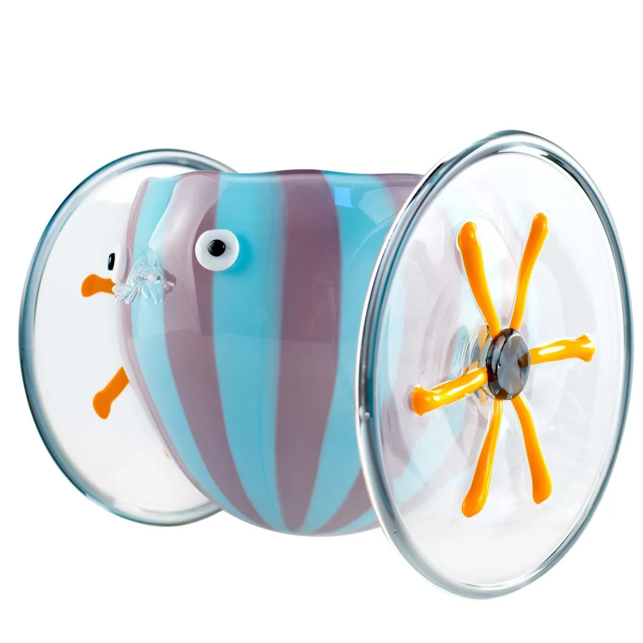 Disegnato da Eliana Gerotto e realizzato da Gianni Seguso, Chariot è una sorprendente rivisitazione della tradizione veneziana, che mescola memoria e tecnica con ironia e un pizzico di pop. In vetro blu e malva, il vaso è sospeso in aria da due ruote in arancione e grigio. Il pezzo è completato da un volto stravagante, con un naso ispirato ai lampadari Rezzonico.