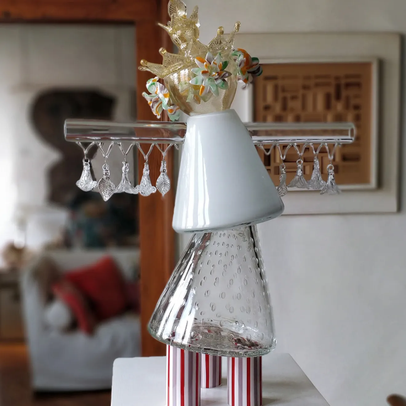 Rezzonica Granda, una serie limitata di dodici pezzi, si ispira agli innovativi lampadari del XVIII secolo, traducendone lo stile in un’imponente forma contemporanea. Con un corpo caratterizzato da una trappola d’aria a balotone, il pezzo poggia su tre colonne nei colori bianco, rosso e malva. I bracci sono decorati con fiori e foglie, mentre la testa è coronata da fiori in stile Torcelo con foglia d’oro.