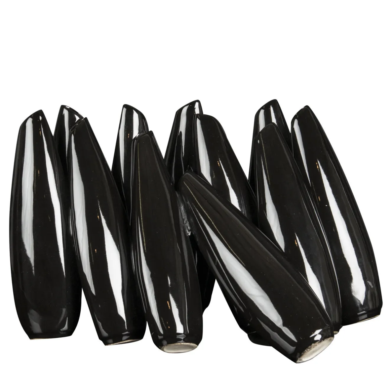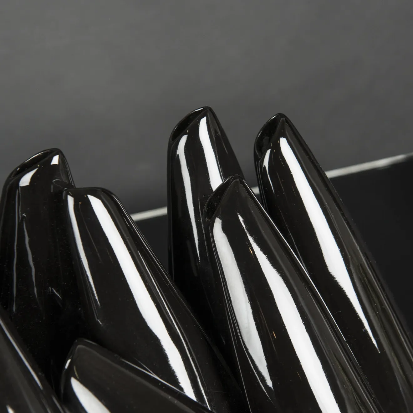 Una composizione scultorea che funge da vaso per una serie di fiori singoli, questo splendido pezzo è il risultato di una lavorazione artigianale dedicata e meticolosa. Realizzato in ceramica laccata nera, è composto da vari elementi in posizione diritta o obliqua, che ricordano i birilli del bowling.
