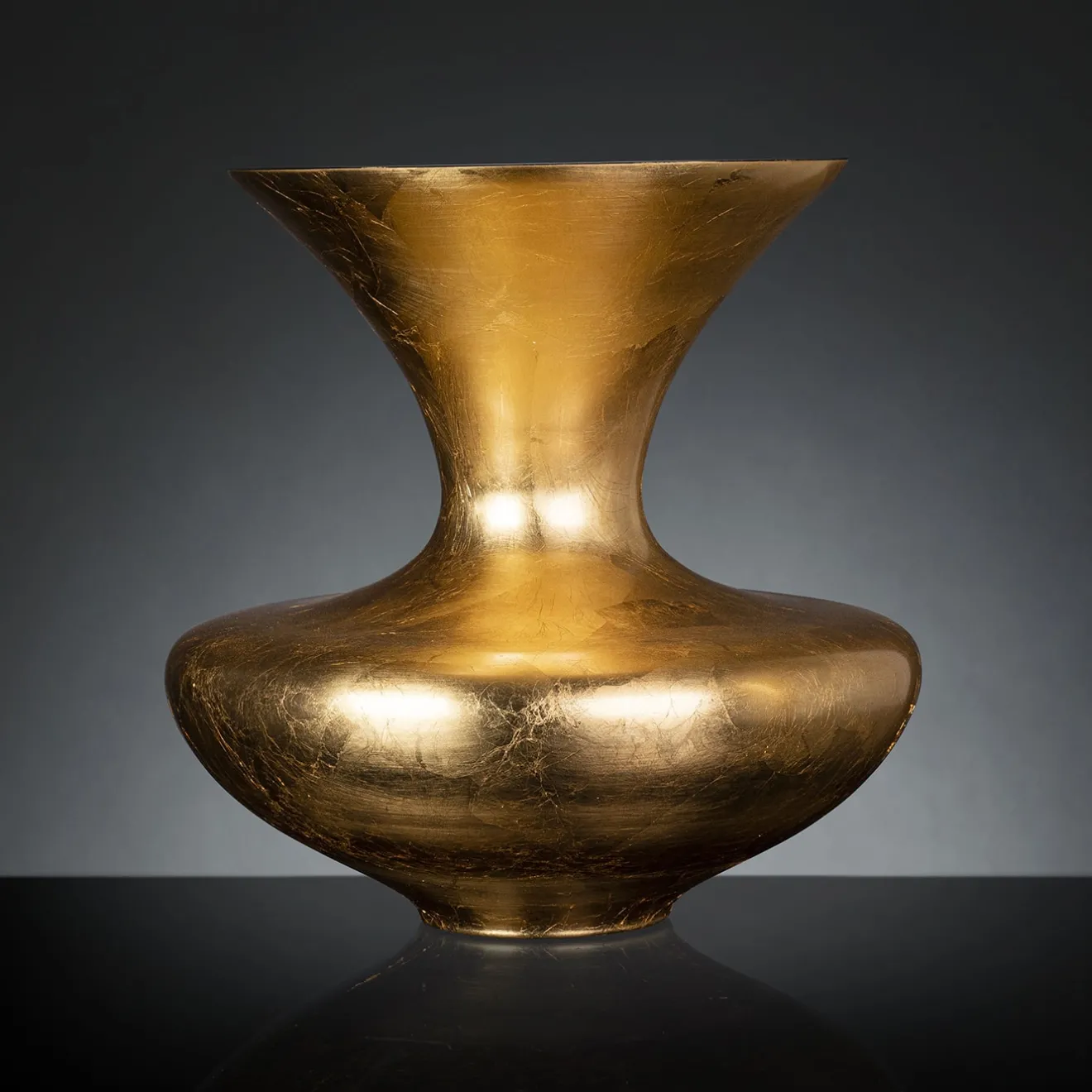 Il carattere elegante e lussuoso di questo vaso lo rende ideale per banchetti raffinati come matrimoni o feste. Realizzato in vetro, la sua silhouette ad anfora viene interamente ricoperta all’esterno da una pregiata foglia d’oro, la cui qualità scintillante incanta qualunque sia il livello di illuminazione dell’ambiente circostante.